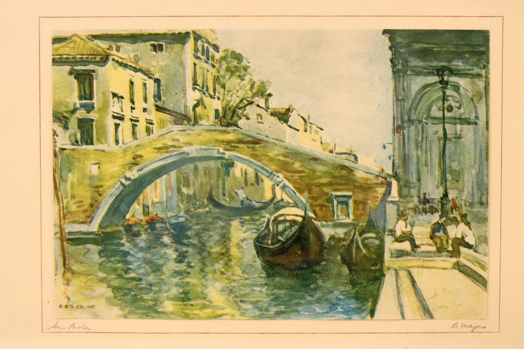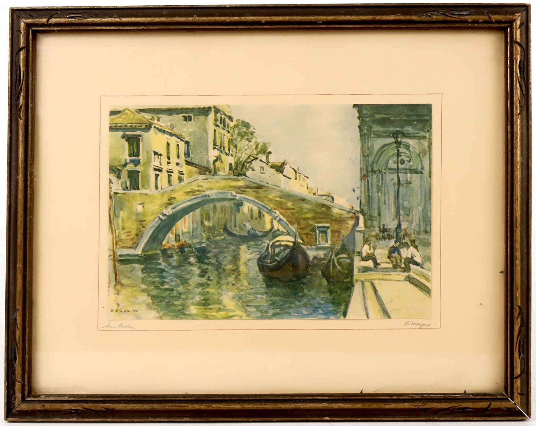 Signed artist's print of a canal in Venice, Italy, in the original art-deco, circa 1920's frame. "San Paolo", signed by B. Major. Print size 4 x 6, frame 7.75 x 9.75". The view is very similar today!