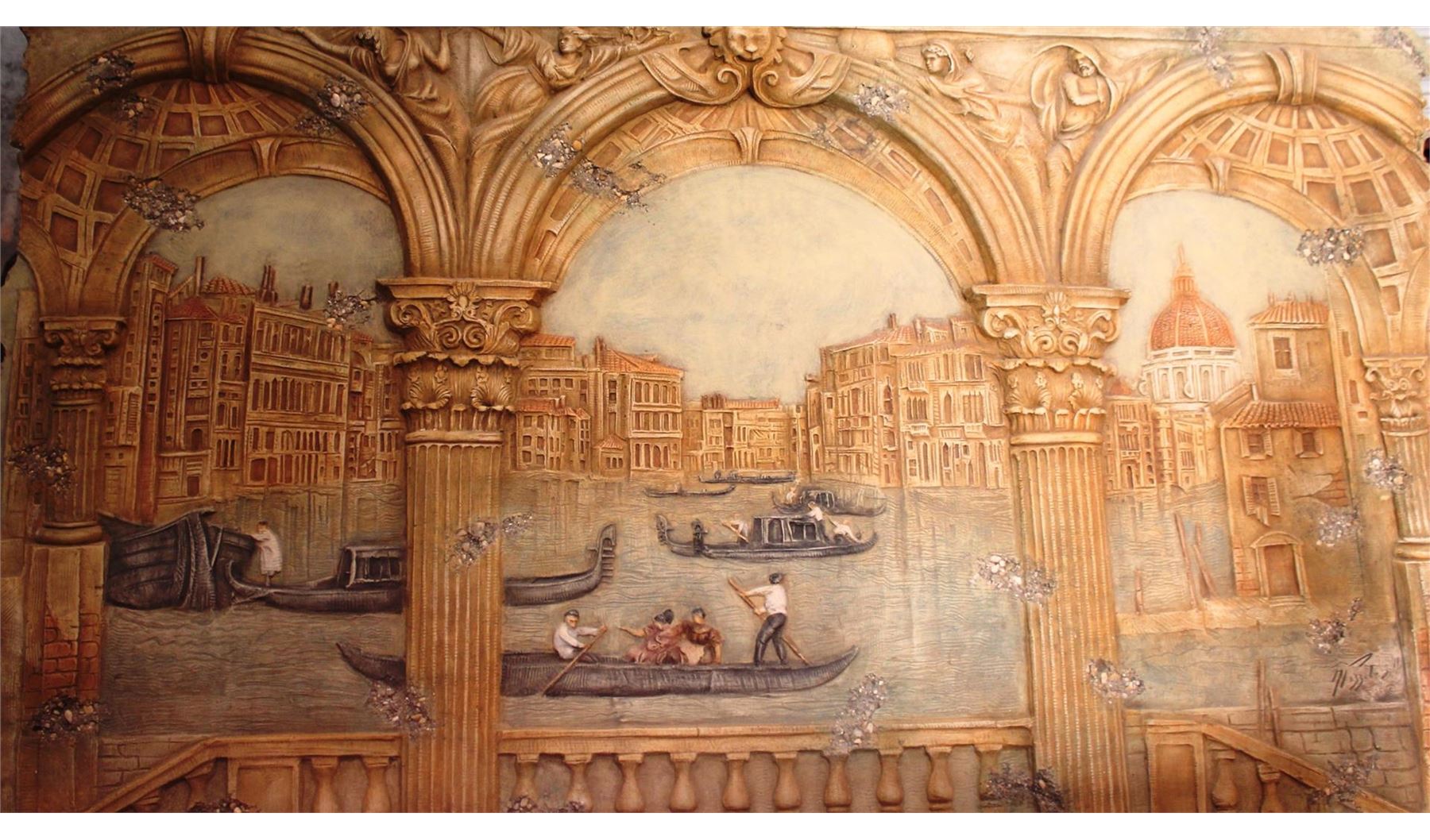 Mauro Pozzobonelli captures the essence of Italy in this intricate, synthetic stone relief of life in Venice. The wall sculpture, edition 5/25, measures 49 x 80.