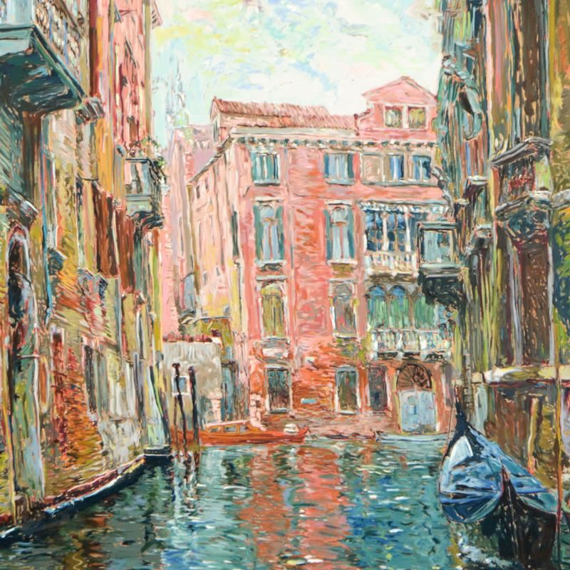 "Venice" is a limited edition serigraph on paper by Marco Sassone, numbered and hand signed by the artist. Includes Letter of Authenticity. Measures approx. 42" x 47.5" (border), 38" x 43" (image).