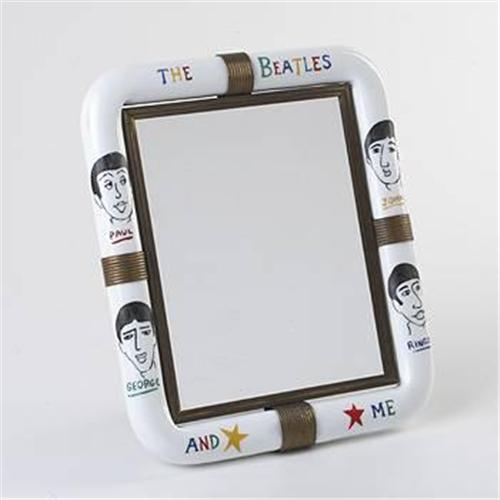 Venini The Beatles and Me mirror Italy, c. 1970 etched and enameled glass, brass 10.75 w x 1.25 d x 12.75 h inches Signed with incised manufacturer's markings to verso: [Venini Murano Italia Incisione A Sabbia Fab. U.S.A. Dal Paos Murano].