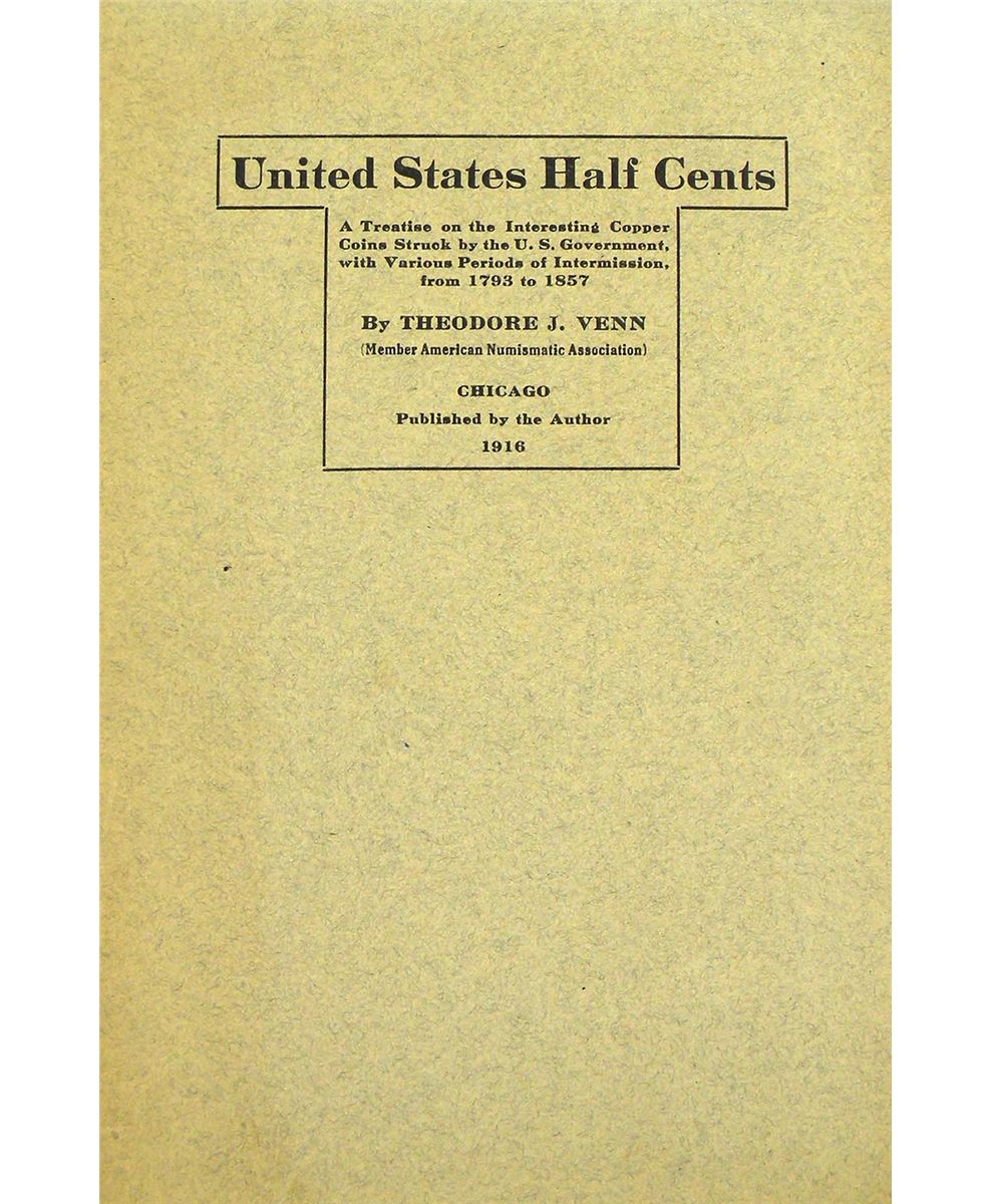 Venn, Theodore J. UNITED STATES HALF CENTS. A TREATISE ON THE INTERESTING COPPER COINS STRUCK BY THE U.S. GOVERNMENT, WITH VARIOUS PERIODS OF INTERMISSION, FROM 1793 TO 1857. Chicago: published by the author, 1916. 12mo, original printed gray card covers. 24 pages. Fine. Probably twice as scarce as his similar title on large cents.
