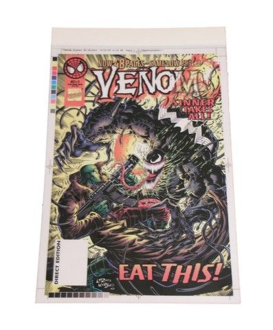 Venom Sinner Comic Book Cover 4-Color Proofs - A truly mind-blowing cover hart for "Venom Sinner" (October 2, 1995) from the legendary Comic artist Greg Luzniak and Scott Koblish. This is the original 4-Color Marvel Comic proofs for the cover printing of the edition. These proofs are usually destroyed shortly after printing. However a few were saved, and are extremely valuable. It features four multi-layered acetates. Very rare and very desirable production art. One-of-a-kind. Approx 7.5x12.5".