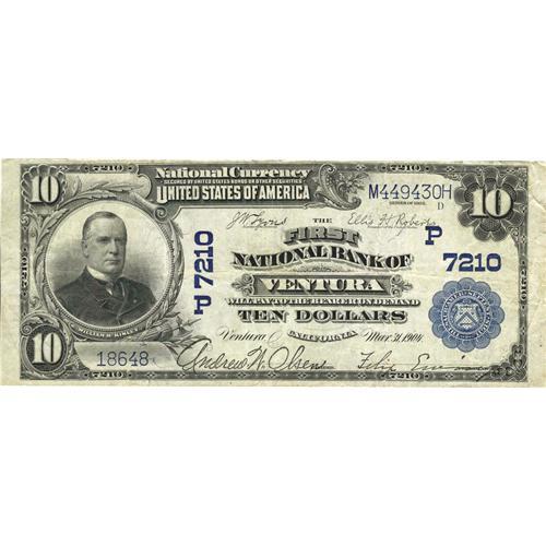 <B>Ventura, CA</B></I> - $10 1902 Plain Back Fr. 624 <B>The First NB</B></I> Ch. # (P)7210<BR>The market has seen a few of these large size notes, but none this nice since we presented a small collection of Ventura notes in our 2004 September Long Beach Sale. This totally unmolested issue boasts bright, unsoiled paper and a most appealing bold blue overprint. <B>Very Fine+.</B></I>