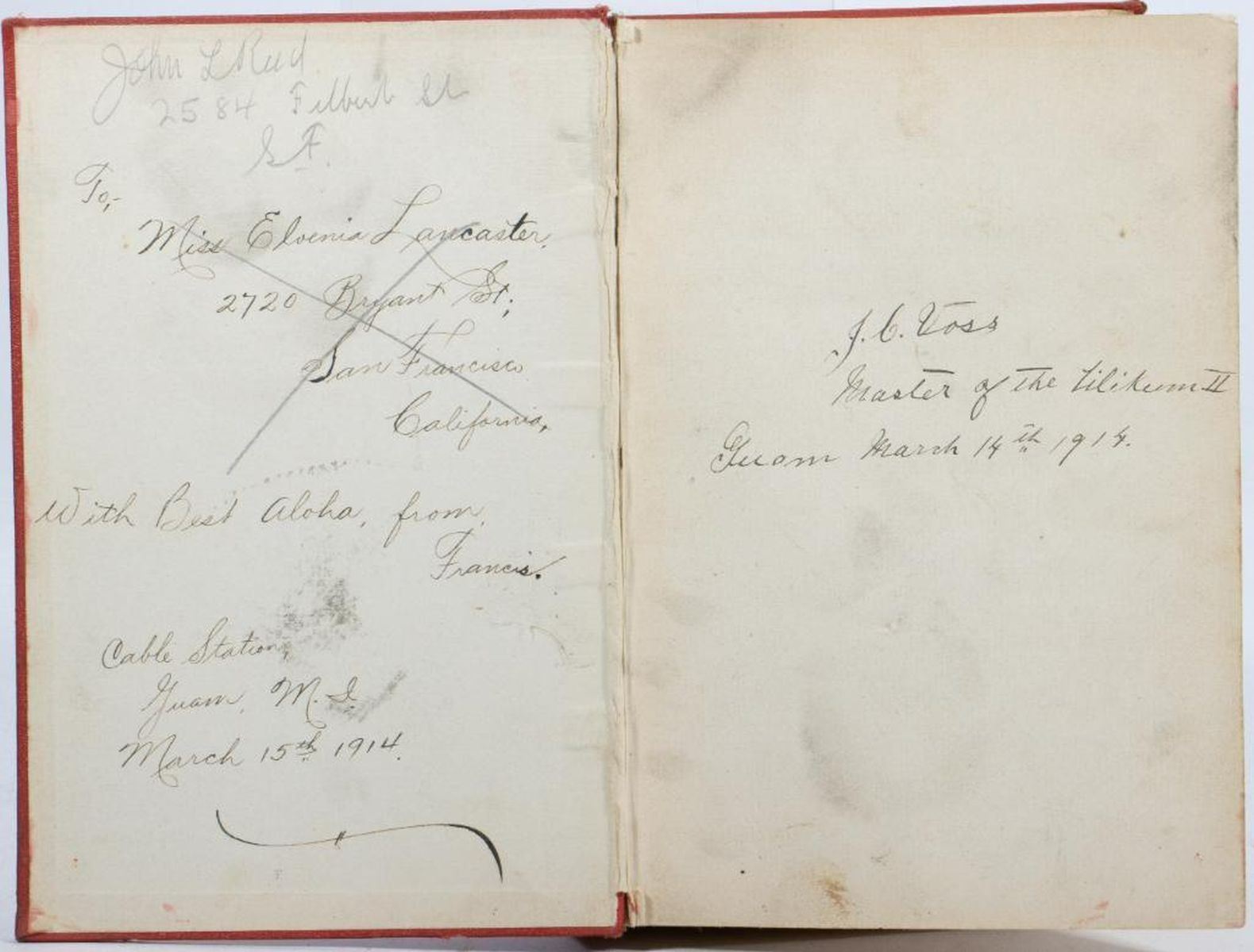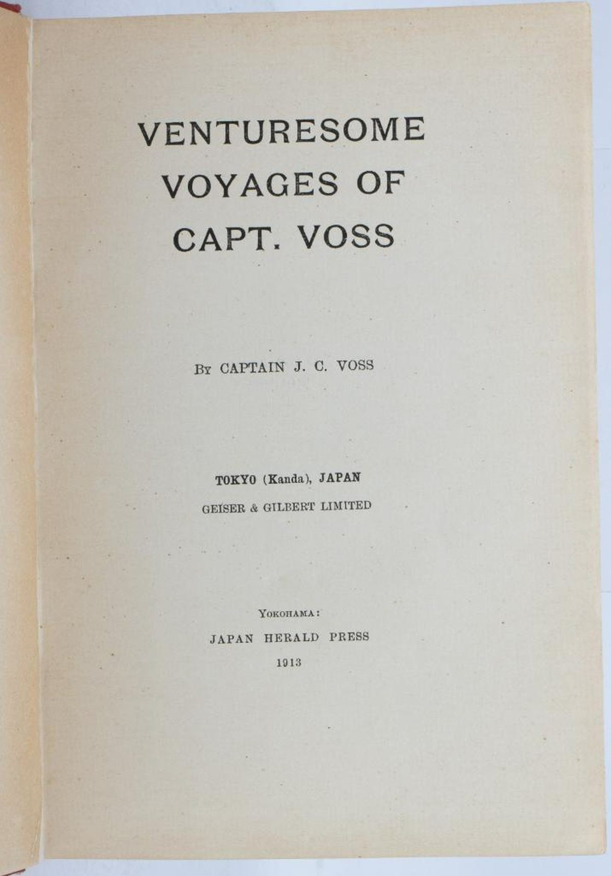VOSS, J. C. [JOHN CLAUS]. Venturesome Voyages of Capt. Voss. Tokyo: Geiser & Gilbert Limited; Yokohama: Japan Herald Press, 1913. First edition. 8vo. Red cloth, gilt. Signed by Voss, and dated at Guam, March 14th, 1914; with facing inscriptions by others in ink and pencil, one presenting the volume on March 15th, 1914. Fair; gilt is bright, cloth soiled, spine faded and wear to ends, loosened, toning. John Claus Voss (1858-1922) was a German-Canadian sailor from British Columbia, who sailed around the world 1901-04 in a modified dugout canoe named the Tilikum.