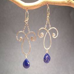 Metal: Gold Hammered spiral shapes with your choice of stone (lapis, blue tuquoise, royal blue chalcedony, purple jade, and citrine shown), about 1-3/4". Available in either 14K gold-filled, rose gold-filled, or sterling silver. All jewelry is entirely handmade in our studio in New York.