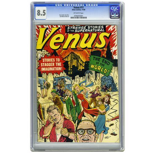 <B>Venus #11 (Atlas, 1950) CGC VF+ 8.5 Off-white pages.</B></I> This issue's "End of the World" cover makes it one of the most valuable of this series' run. Russ Heath contributed interior art to the issue. Overstreet 2006 VF 8.0 value = $531; VF/NM 9.0 value = $841. CGC census 3/06: 1 in 8.5, none higher.