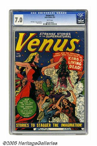 <B>Venus #13 (Atlas, 1951) CGC FN/VF 7.0 White pages.</B></I> Though Venus began as a "good girl"-type character, by this point in her series she was hosting a horror mag! This issue has a Bill Everett cover, with interior art by Everett and Dave Berg. Overstreet 2005 FN 6.0 value = $231; VF 8.0 value = $481. CGC census 7/05: 1 in 7.0, none higher.