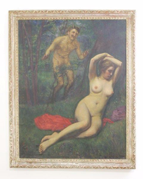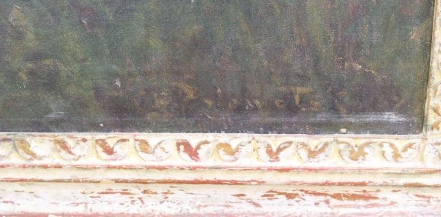 Oil on canvas mounted on board. Framed. Artist signed lower right. 19th century. Approx. 34" H x 44" W image, 39" H x 50" W framed. From the home of a N.Y. designer.