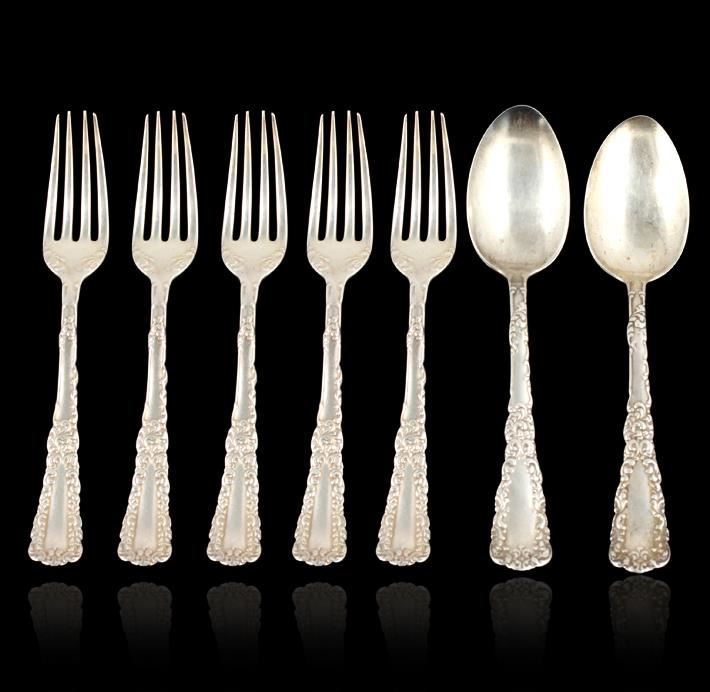 Set of forks and spoons in the Venus Sterling 1901 pattern by International Silver, hallmarked with genuine "F.L. Trepag, F.P. Bro," featuring: 248.6 grams of sterling silver.