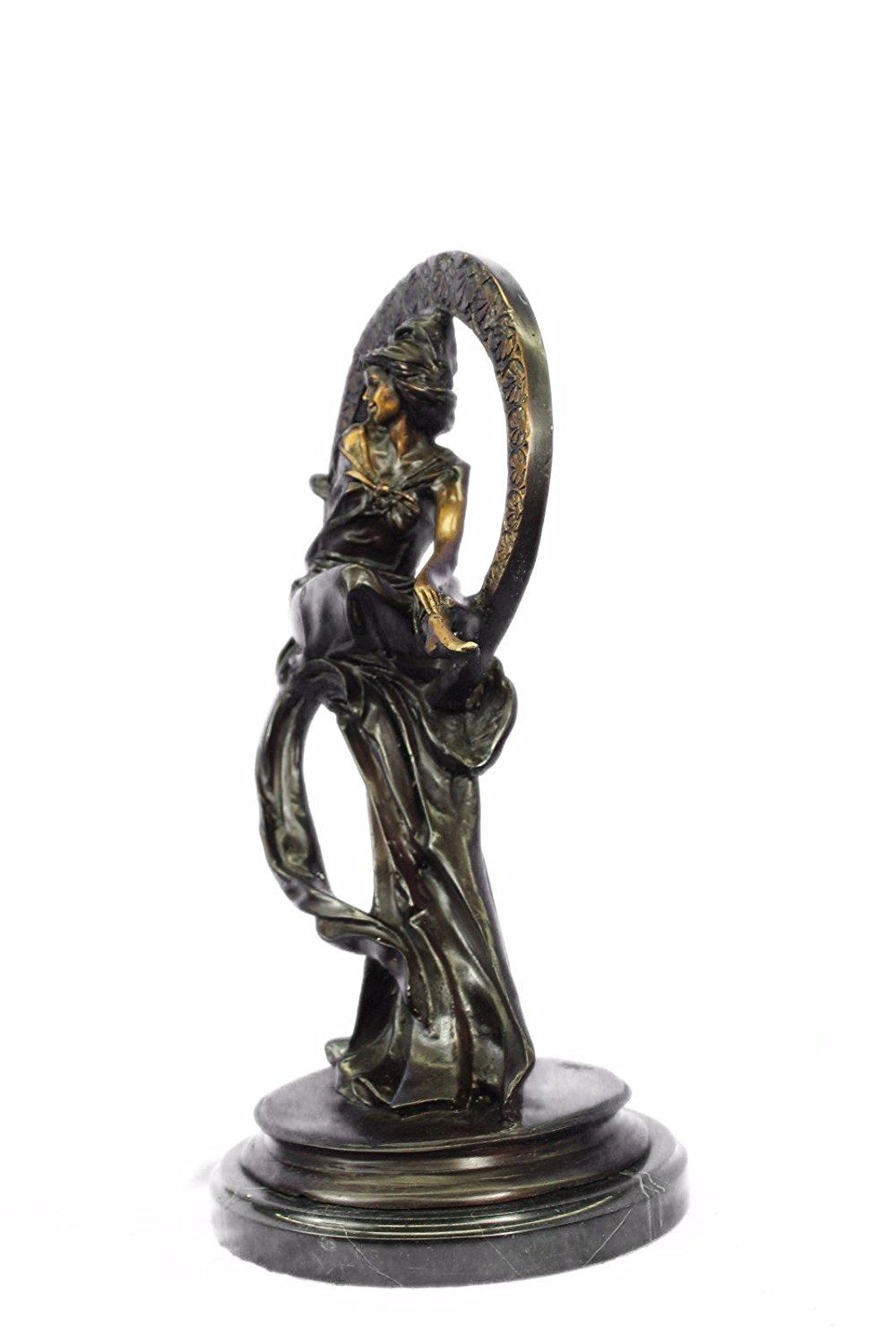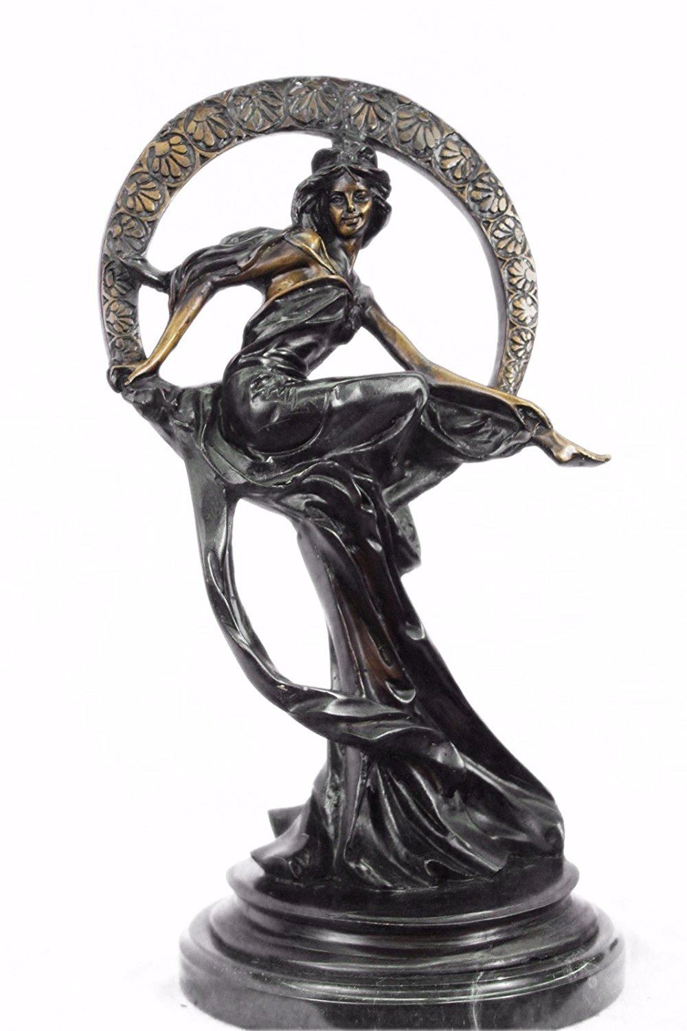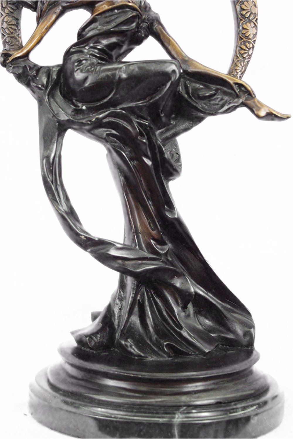 Dream goddess sits in a ring of bliss that is filled with a loving warm energy. Her beautifully long dress wanders away in the wind, almost as if it is doing a small dance to the dreams of the night. Her hair blows softly in the wind and creates a great captured motion. She has unbelievable beauty and gives off the ora of bliss and love. Her face is that of an angel and she sits in the most gorgeously detailed ring, watching over the dreams of the world. She was cast using the Lost Wax Method and has a gorgeous two toned brown patina. Bronze Dimensions with Marble Base: Height 24 X Width 11 inches. Weight: 25 LBS. Inventory: 32-9504721523