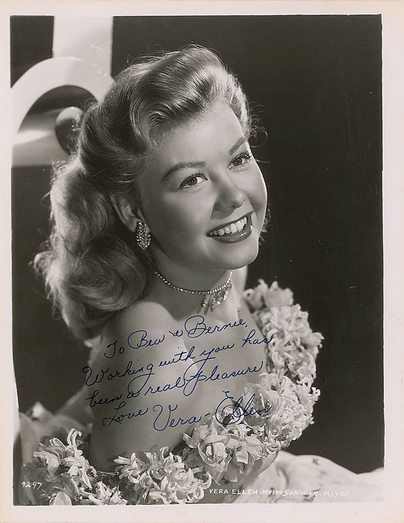 Vintage glossy 8 x 10 MGM publicity photo, signed and inscribed in fountain pen “To Bea & Bernie, Working with you has been a real pleasure. Love, Vera-Ellen.” In fine condition, with some scattered light creases and surface marks.
