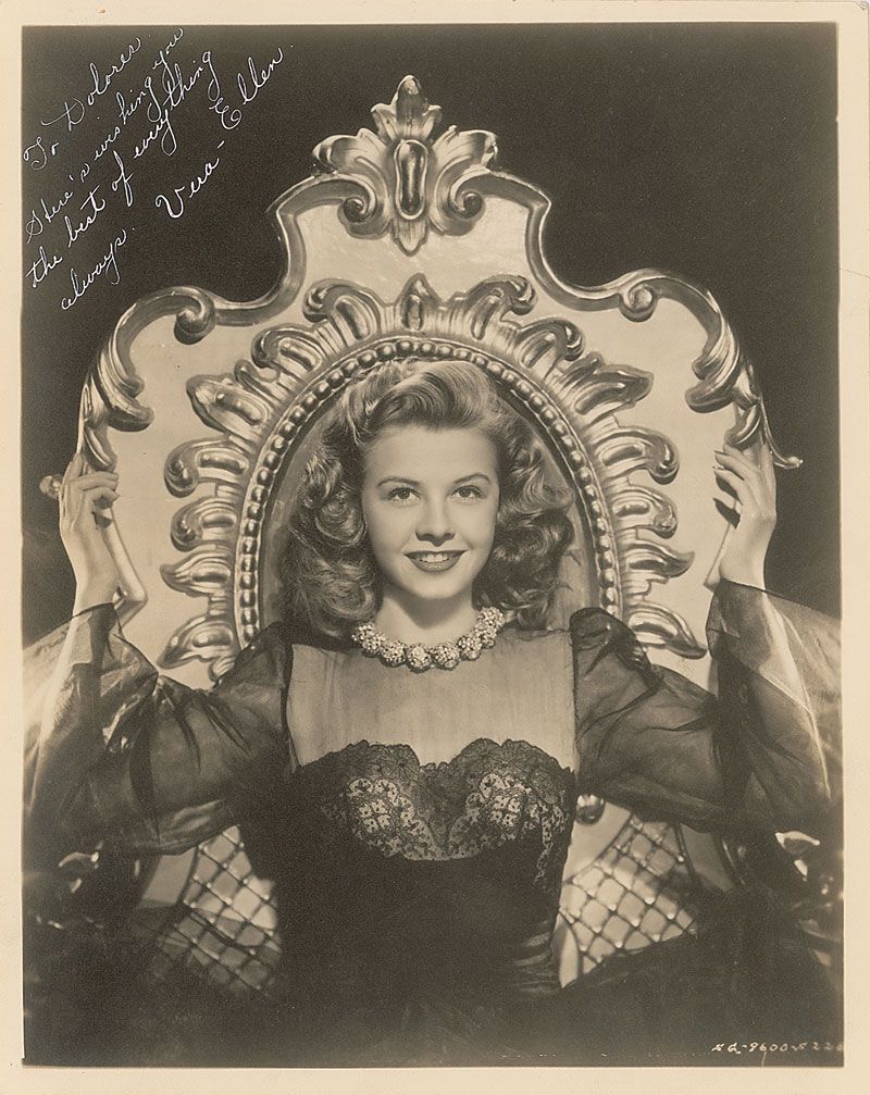 Vintage matte-finish 8 x 10 photo of the actress in black lace leaning against an ornate headboard, signed and inscribed in white ink “To Dolores, here’s wishing you the best of everything always. Vera-Ellen.” In fine condition.