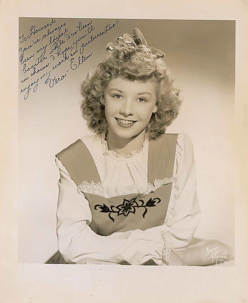 Two photos: vintage glossy 8 x 10 photo of Vera-Ellen seated with her long legs extended, signed and inscribed in fountain pen, “To Joan, I wish you health and happiness too. May you have good luck in all you do, Vera-Ellen”; and a vintage glossy 8 x 10 portrait of the actress by Bruno of Hollywood, signed and inscribed in fountain pen, “To Howard, You’ve always been my loyal booster while I’ve been in shows. I hope you’ll enjoy my work in pictures too! Vera-Ellen.” In overall fine condition, with some surface rubbing to one of the signatures.