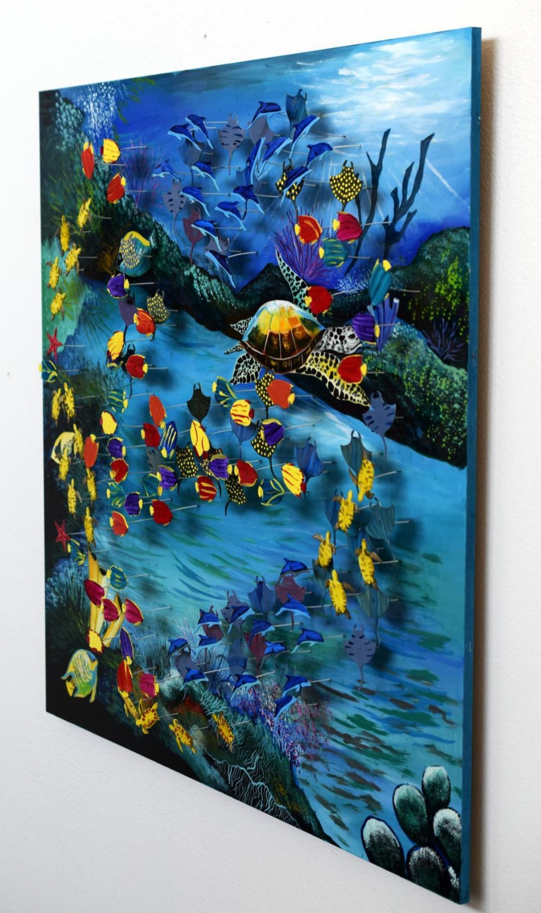 Artist: Vera V. Goncharenko. Medium: Original Painting on Cutout Steel and Board. Title: Deep Sea Adventure. Size (Unframed): 31.5" x 31.5". Certificate of Authenticity: From the publisher. Additional: 3D work of original one of a kind painting on wood board and laser cut steels. . Reference# 11367.