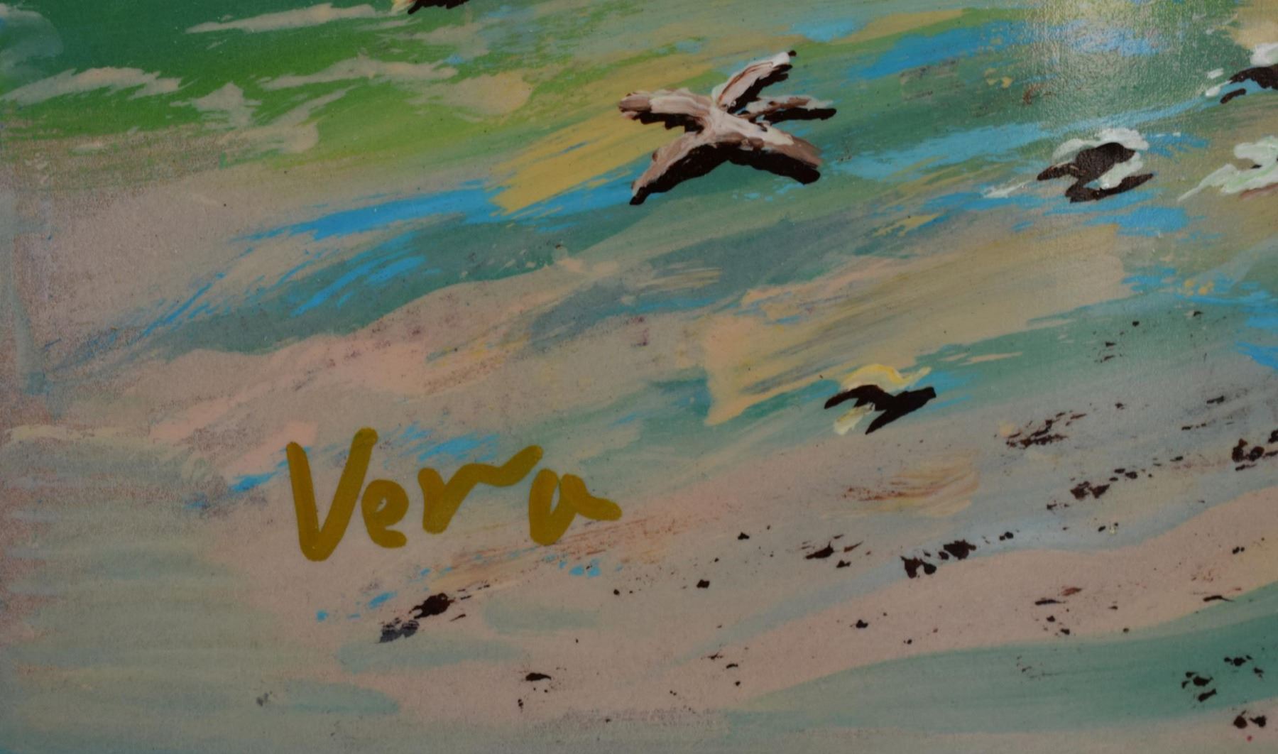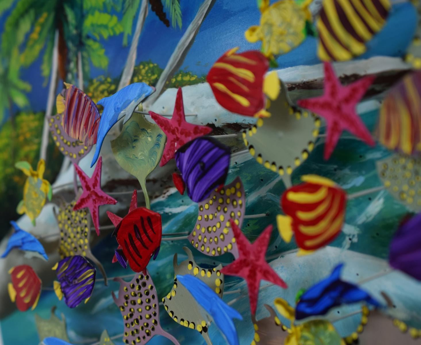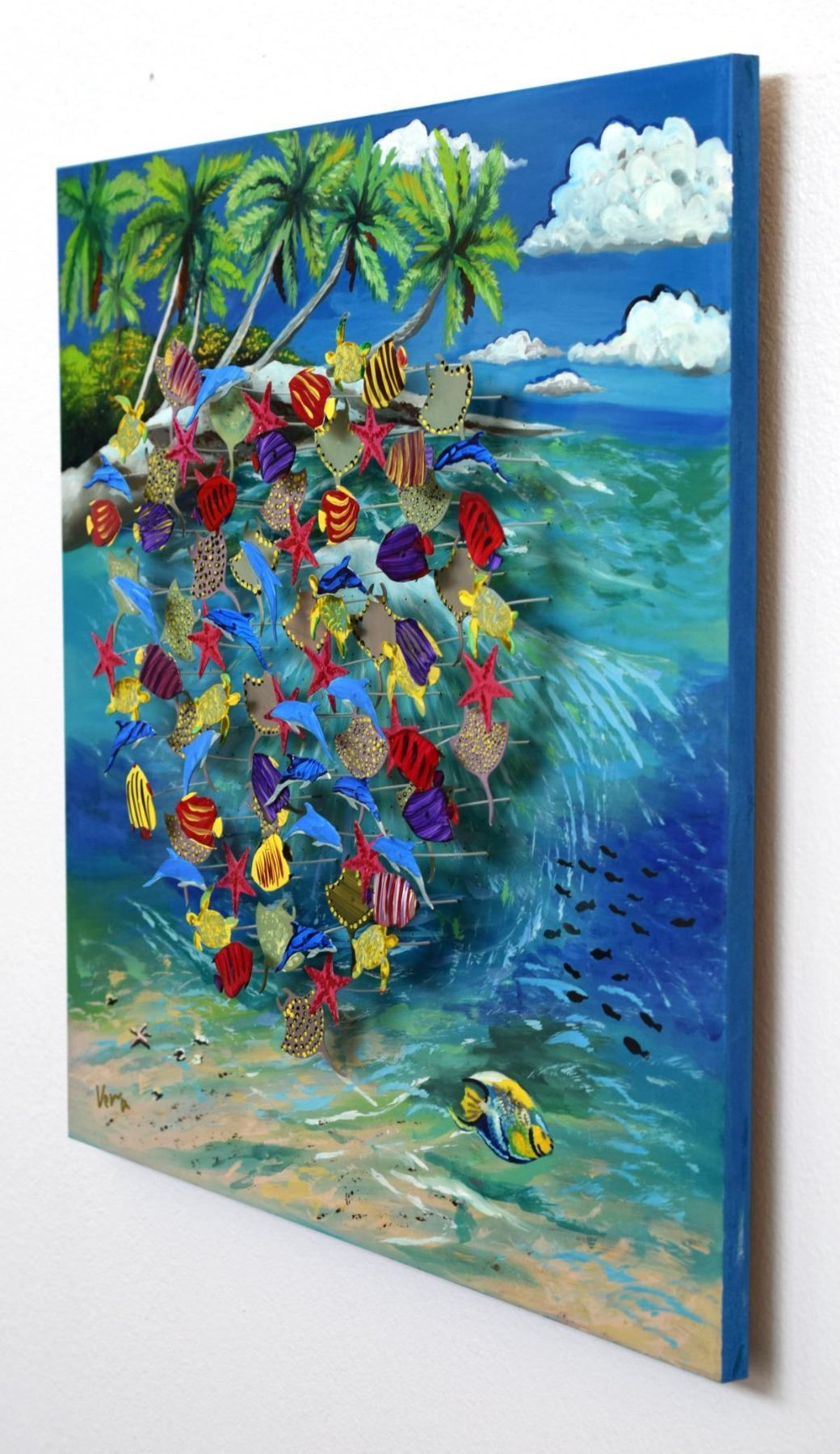 Artist: Vera V. Goncharenko. Medium: Original Painting on Cutout Steel and Board. Title: Love in the Island. Size (Unframed): 23.5" x 23.5". Certificate of Authenticity: From the publisher. Additional: 3D work of original one of a kind painting on wood board and laser cut steels. . Reference# 11365.