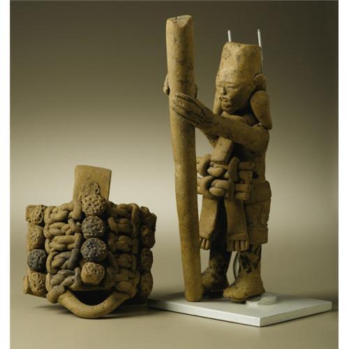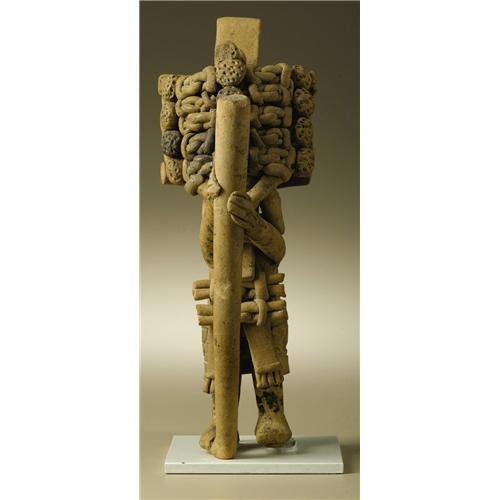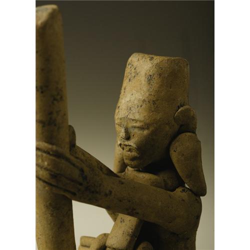 <B>Standing Figure Who Grasps a Pole and Has an Elaborate Removable Headdress</B></I><BR>Veracruz, central area (?)<BR>A.D. 300 - 700<BR>Buff ceramic<BR>Height 10 3/8 in. Width 3 15/16 in.<BR><BR>The figure stands grasping with both hands a pole which abuts the toes of his right foot and slopes slightly outward from the vertical. The head is enlarged and squared off at top to provide support for the removable headdress. His mouth has an everted upper lip which reveals filed upper teeth, which form a T-shape. Large leaf-shaped tabs attached at each ear lobe probably represent some flexible material. A scarf is around the man's neck, knotted almost like a neck tie to give a large tab which covers the chest. At the abdomen two large knotted units are placed one above the other from which two fringed tabs fall to the knees. A kilt completes the figure's dress. The large horizontally-oriented center band of the kilt has a low relief representation of a Tajín-derived profile serpent head facing toward the proper right. In the upper right corner of this band the Maya Venus sign appears.The elaborate removable headdress has an overall shape reminiscent of a shako, complete with chin strap. As visible from the front, a broad, flat-looped piece rises vertically at rear center. Below this, five horizontal bands form the headdress proper. Each is composed of center and side-termination puffs (probably cotton but possibly downy feathers) between which are placed elaborate knots. Three pairs of punched holes near the bottom would have allowed the headdress to be tied firmly to the main figure. The overall condition is good, with scattered surface mineral deposits. Various breaks have been repaired, with more of these in the headdress, on which the lowest rear horizontal band at the proper left is a modern replacement.<BR><BR>Provenance<BR>Bonhams & Butterfields, San Francisco: sale 7477E, 8 December 2003,