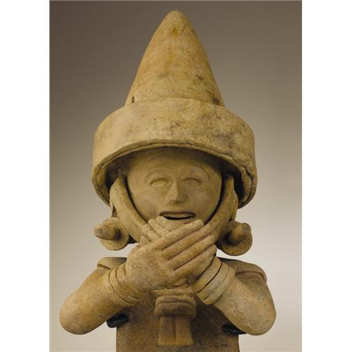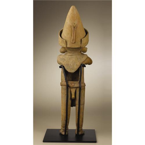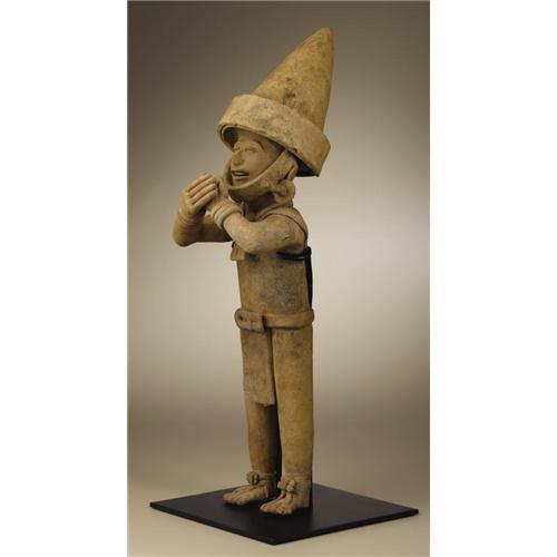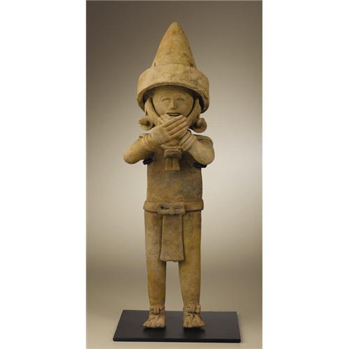 <B>Standing Male Figure with Conical Headdress and Hands Clasped in Front of Face</B></I><BR>Veracruz<BR>A.D. 300 - 900<BR>Ceramic, traces of original red paint<BR>Height 25 in. Width 8 in.<BR><BR>The tall, rather narrowly-proportioned figure stands straight with his arms raised so that the hands meet in front of the chin as if in prayer, the left hand inside the right. Other than the headdress and elaborate ear spools, he is dressed with a necklace, a cape which falls to a rounded tip in back, three bracelets on each arm, a loincloth, and sandals with knots in front. The large conical headdress has a broad bottom band and is attached by a wide chin strap. A small double component hangs on the back of the conical element. The circular ear ornaments have long tubular projections thrusting forward.<BR><BR>Rather extensive breakage has been consolidated and repaired. There is a thermoluminescence report from Laboratory Ralf Kotalla (No. 07220303) indicating firing 1200 years before present with a 20% variable. A copy of this report will be available for inspection.<BR><BR>Provenance<BR>Mr. Calderon, Los Angeles<BR>Splendors of the World, Haiku, Hawaii.<BR><BR>