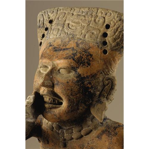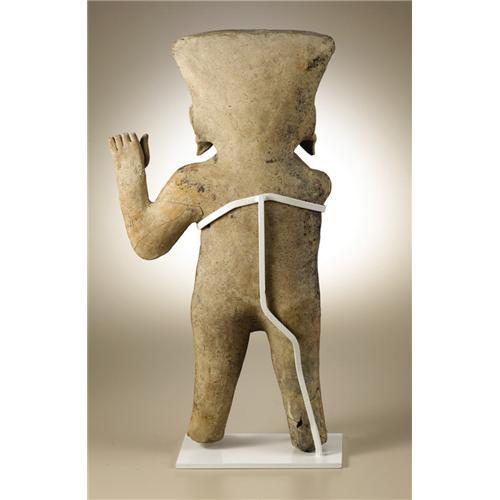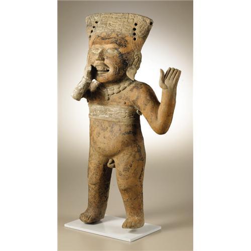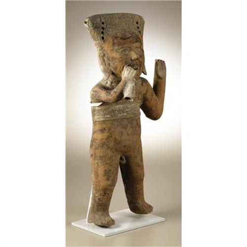 <B>Standing Male Figure with his Right Hand to his Smiling Mouth</B></I><BR>Veracruz<BR>A.D. 300 - 700<BR>Ceramic, traces of original paint<BR>Height 20 in. Width 10 1/2 in.<BR><BR>The basically naked male figure stands with legs slightly spread, his left arm away from his side with forearm raised and hand held palm outward with fingers and thumb extended. He holds his right hand, to which a wristband attaches a short horn-like object, to the corner of his open mouth. His flattened head is trapezoidal, with the typical Veracruz turban-like head covering. Leaf-shaped tabs attached to his earlobes may represent some flexible material. His facial expression is bemused rather than broadly smiling. A bordered band binds his torso below a double-strand bead necklace with a simple, schematic central face pendant. The middle of the chest band shows intertwined, scrolling patterns at the center of which may be simplified, perhaps misunderstood components of a profile serpent head. His turban is centered with a symmetrical serpent-derived eye-cheek combination, flanked at either side just outside four ascending holes by profile serpent heads which face outward at an angle toward the upper headdress corners. Scrolls ripple along the top. The figure has been reassembled from several relatively large components, but with very little replacement. The entire surface has a consistent patination of root marks and mineral deposits, along with traces of original paint.<BR><BR>Provenance<BR>Skinner, Boston: sale 2209, 20 September 2003, Lot 48, p.17<BR><BR>