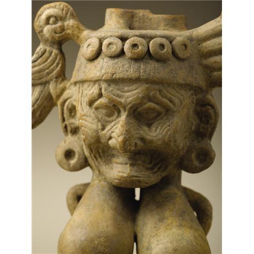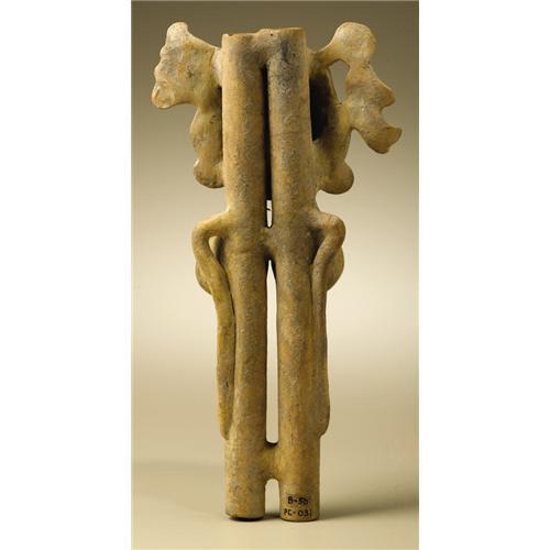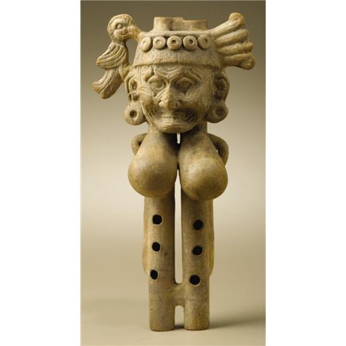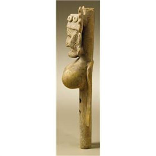 <B>Double-chambered Flute with Head of an Old Person with Balloon-like Breasts</B></I><BR>Veracruz<BR>A.D. 300 - 600<BR>Buff ceramic<BR>Height 7 5/8 in. Width 3 7/8 in.<BR><BR>Although mold-made, this head of a very old person is fully detailed and expressive, the overall network of wrinkles carefully shown. A non-symmetrical headdress has an arrangement of four feathers toward its left. This is balanced at its right by a vividly rendered hummingbird-like avian thrusting its beak into the headdress proper. A band of appliquéd disks joins the two side elements across the top of the headdress. Large ear spools complete the figure's décor. Coils of clay were attached at the outside of either flute barrel to suggest shoulders and arms. The image is completed by pendulous, balloon-like breasts. The two flute barrels, joined near the end, further the suggestion of a full figure. Each barrel has three finger holes.<BR>The large number of surviving examples, plus the considerable typological complexity of some, suggest that music was a central and highly developed component of ancient Veracruz ritual performance. The use of flutes with hand drums, some played at the same time by one performer, survives today among a number of Middle American groups.<BR>The flute was found broken into several pieces. These have been reglued with replacement material, except for the breasts, which are largely rebuilt.<BR><BR>Provenance<BR>Collection of Stanley Marcus, Dallas<BR>Collection of Paul L. and Alice C. Baker, Tuscon, Arizona<BR>Bonhams & Butterfields, San Francisco: sale 7594E, 6 December 2004, Lot 1520, p.150<BR><BR>Publications<BR>Jane Stevenson Day, PH.D, <I>Precolumbian Art From the Collection of Paul L. and Alice C. Baker,</B></I> Tucson, Tucson Museum of Art, 1996, ill. p.79, fig.87<BR><BR>