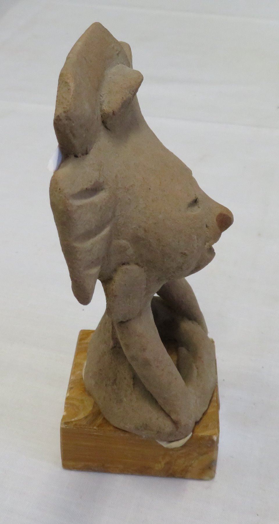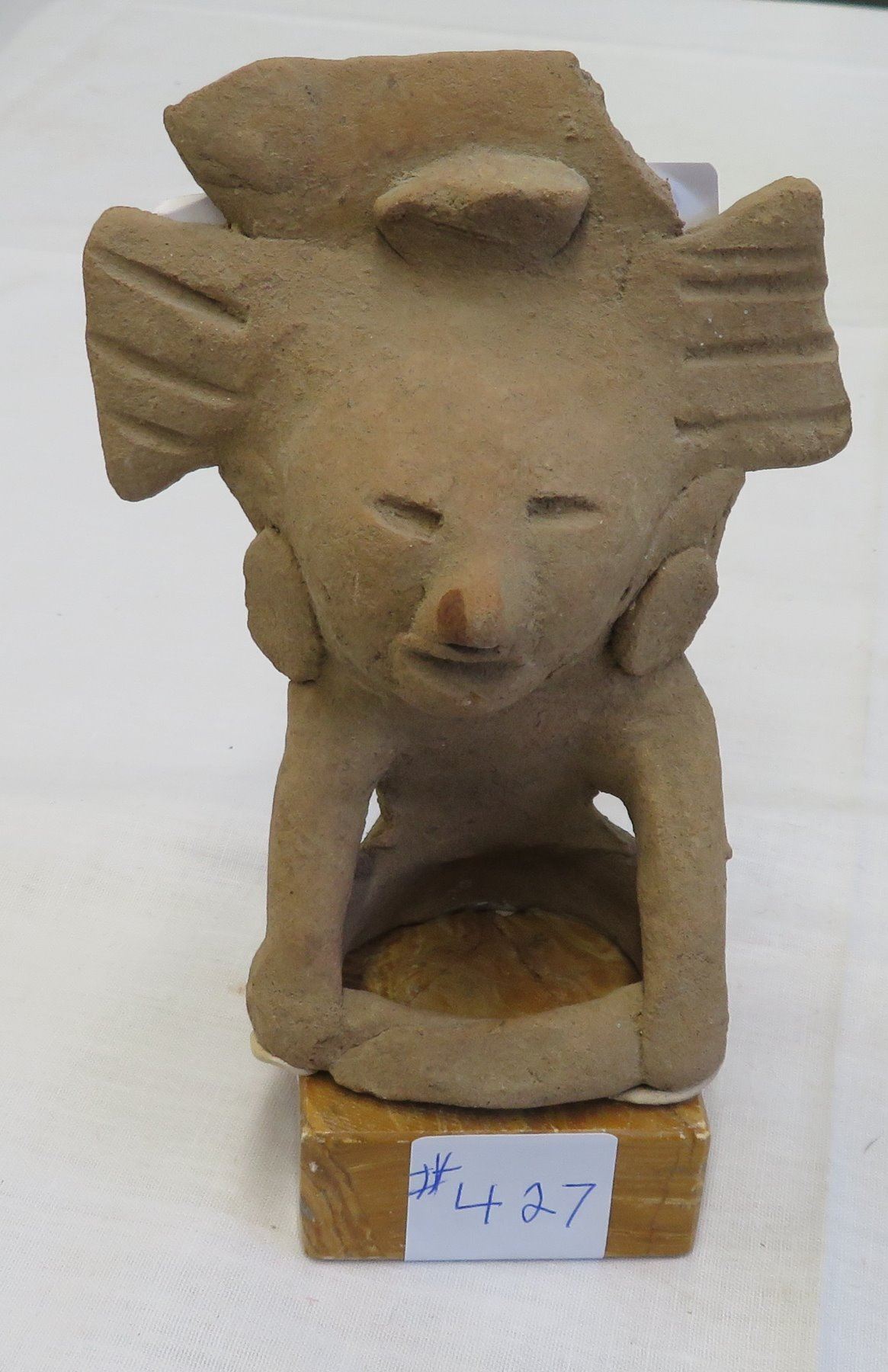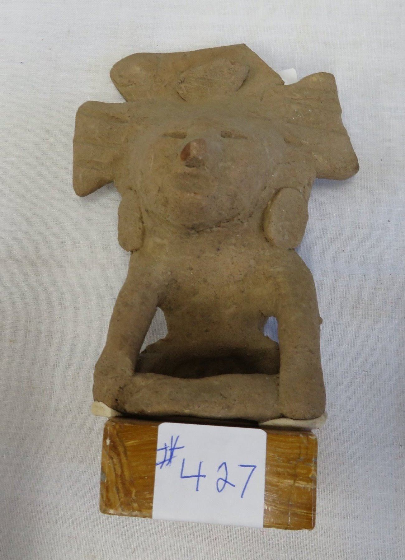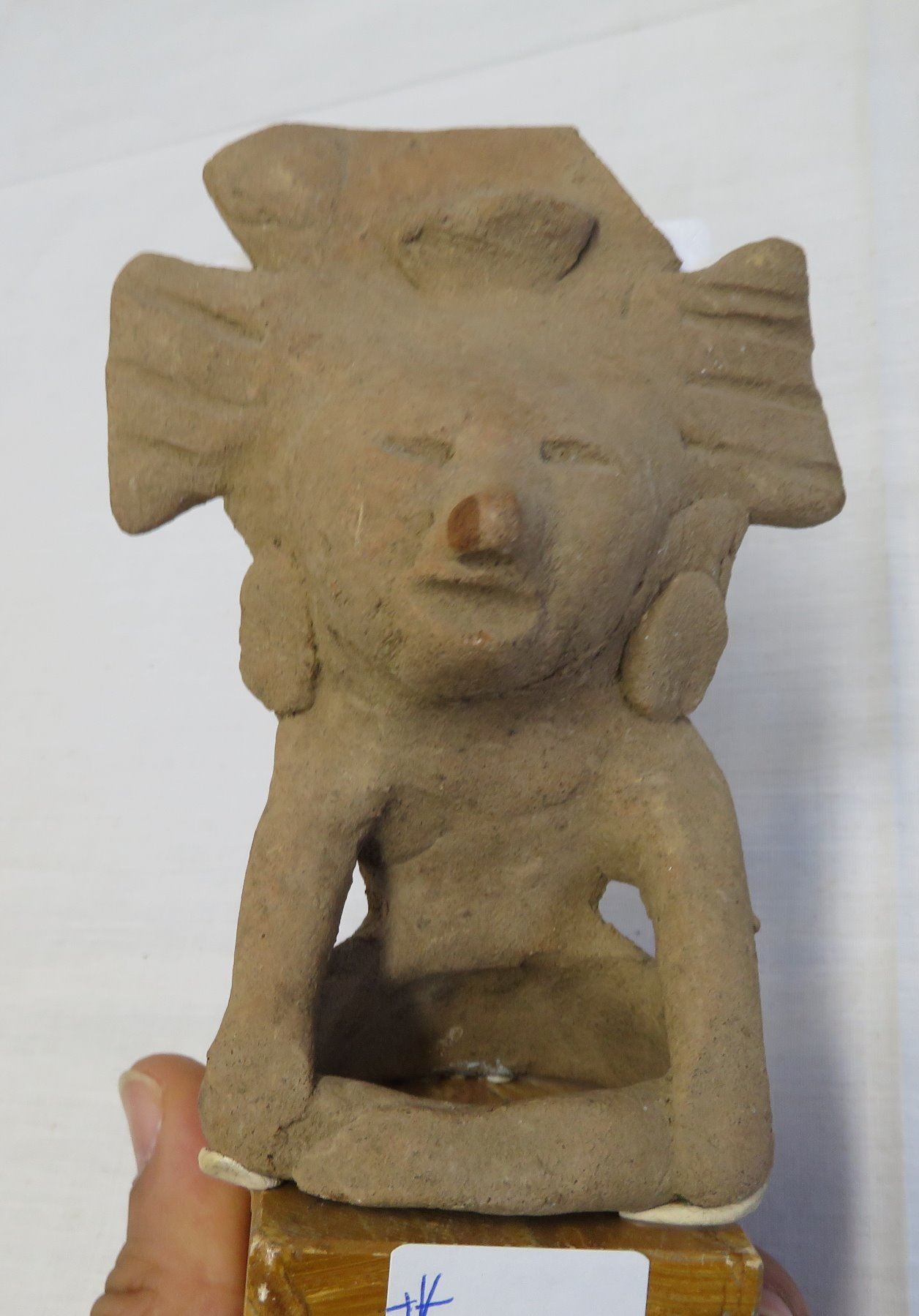 Veracruz Figure on Stand, pre-Columbian item. Made of clay, the item measures 6" x 3" x 2 1/2". Veracruz, Mexico. Condition: As found, see images. Shipping: $20.00 w/insurance and signature.