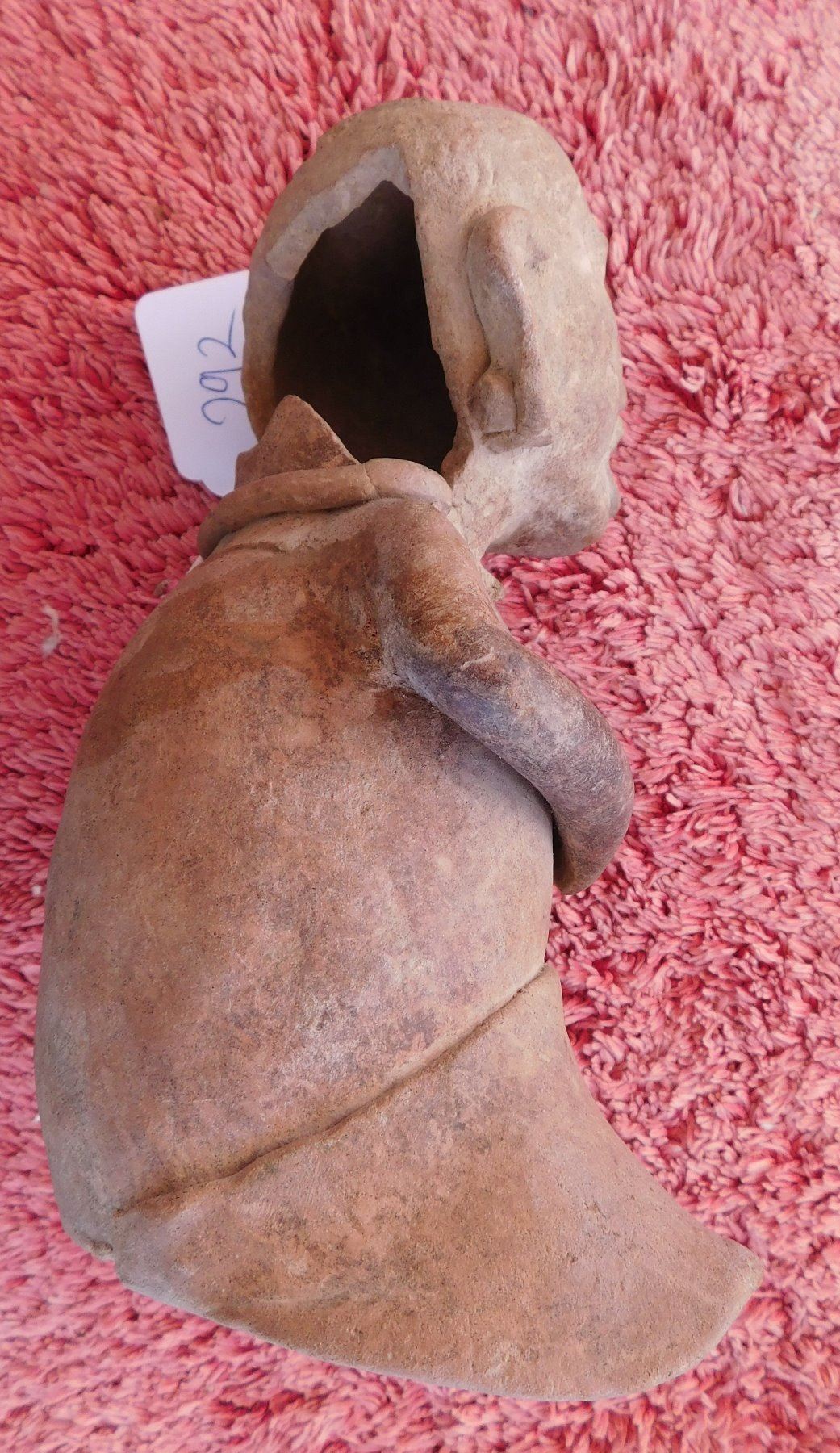 Veracruz Figure, pre-Columbian item. Made of clay, the item measures 4.25" x 8" x 4.5". Veracruz, Mexico. From an old, 1960s California collection. Condition: Foot missing, hole in back, see images. Shipping: $23.50 w/insurance and signature.