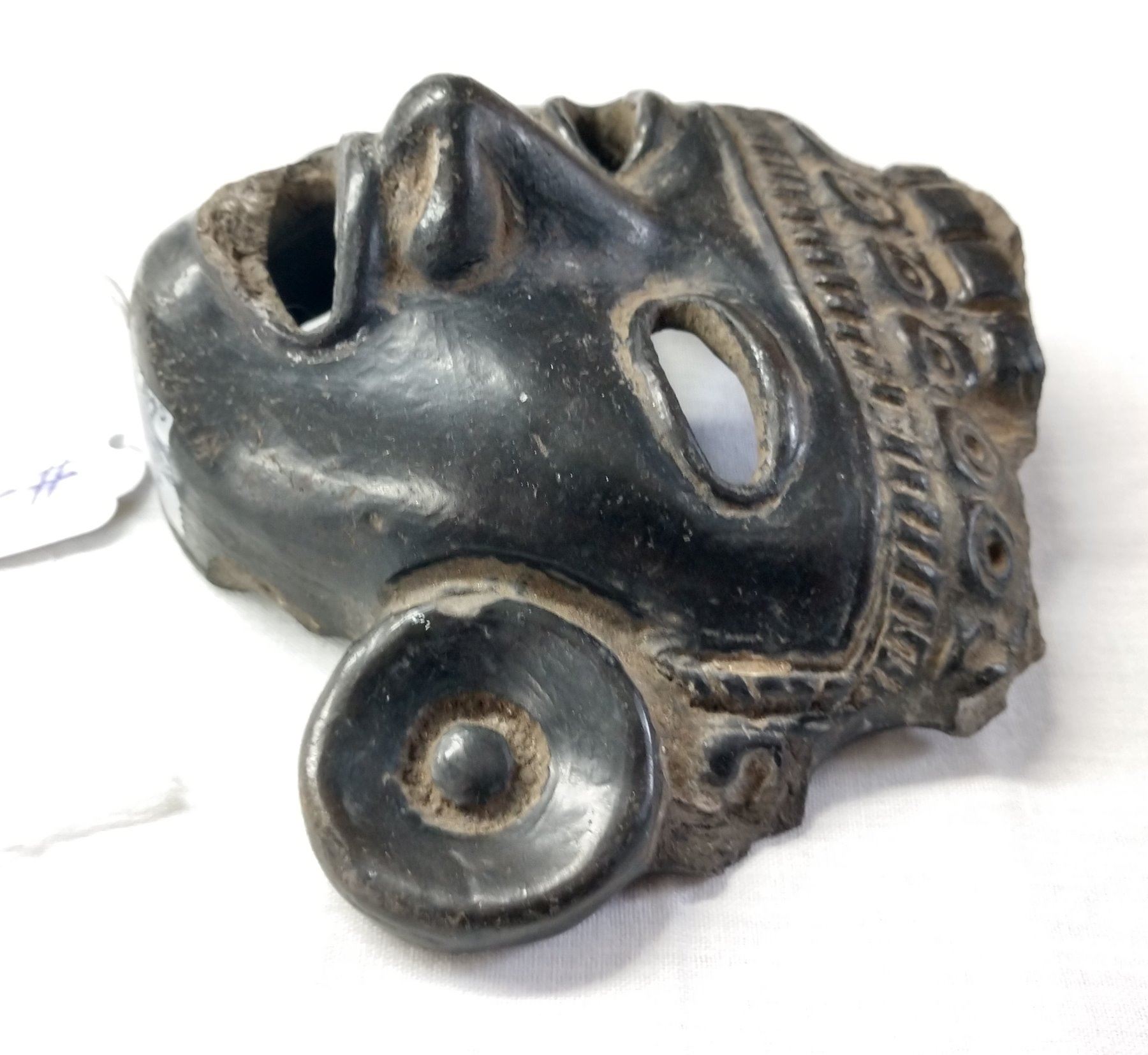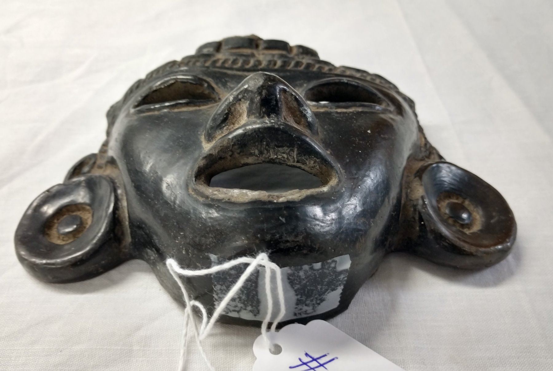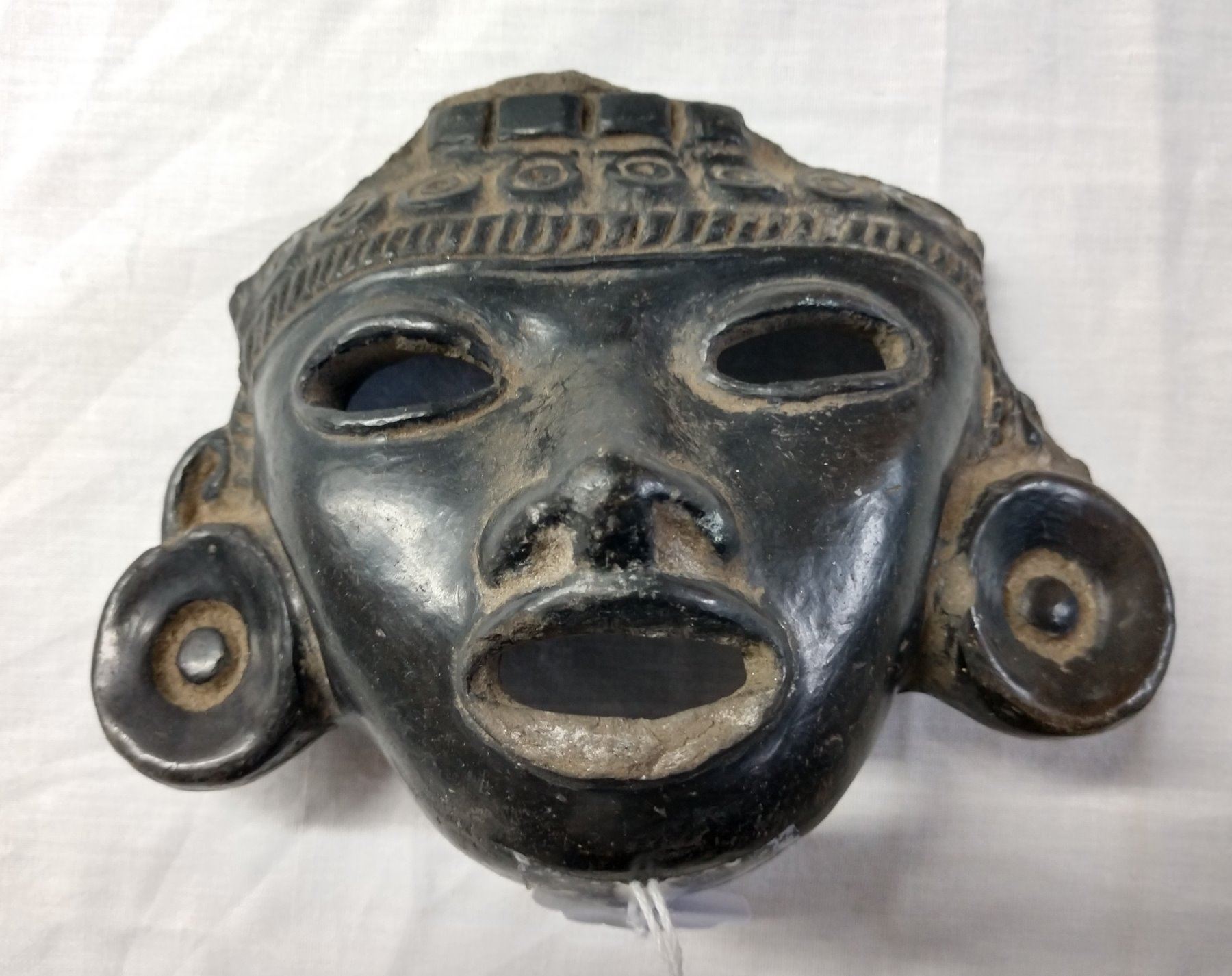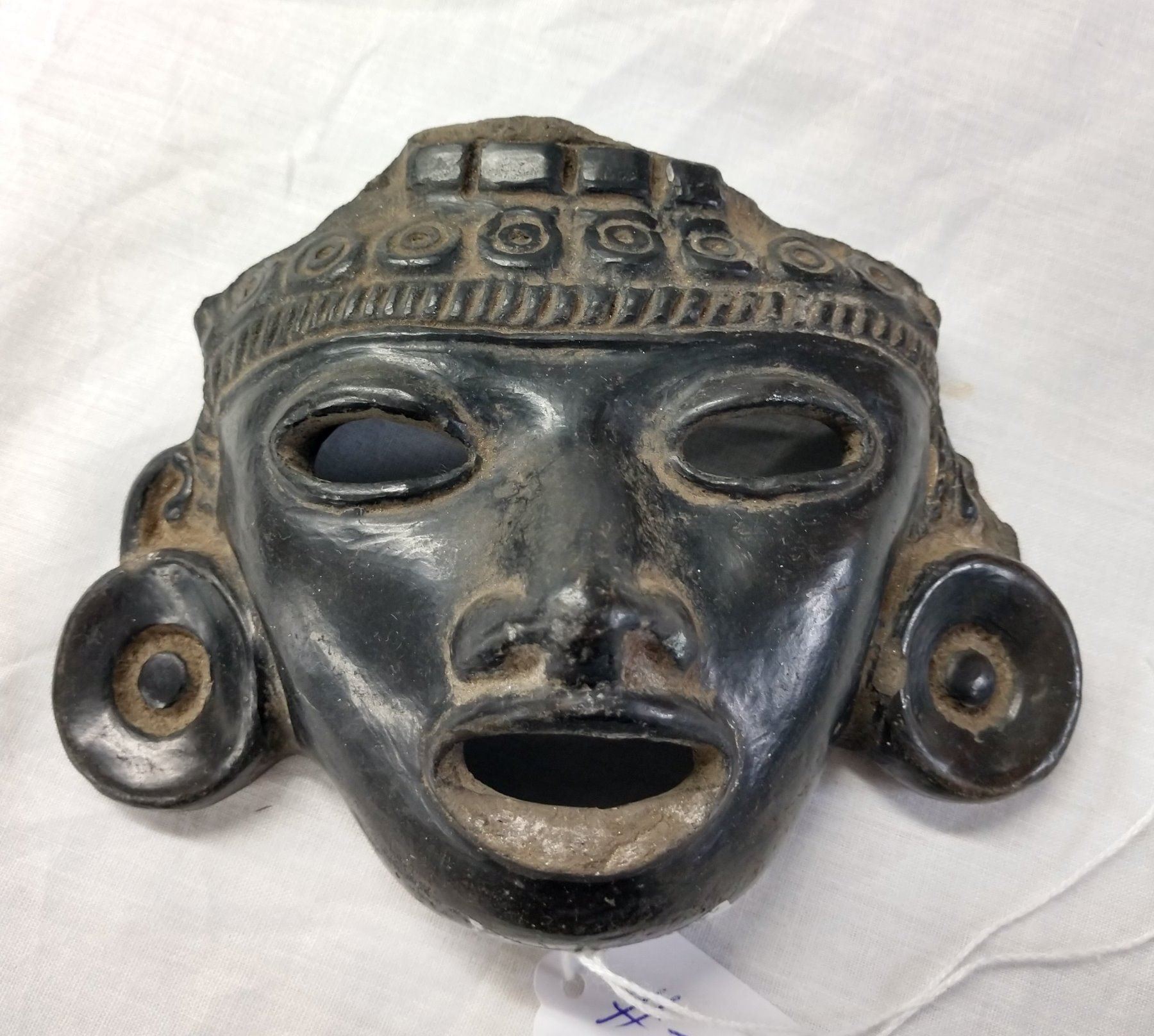 Veracruz Mask, pre-Columbian item. Made of black clay, the item measures 5 1/2" x 4" x 2". Veracruz, Mexico. From an old, 1960s California collection. Condition: Damage on top, see images. Shipping: $22.50 w/insurance and signature.