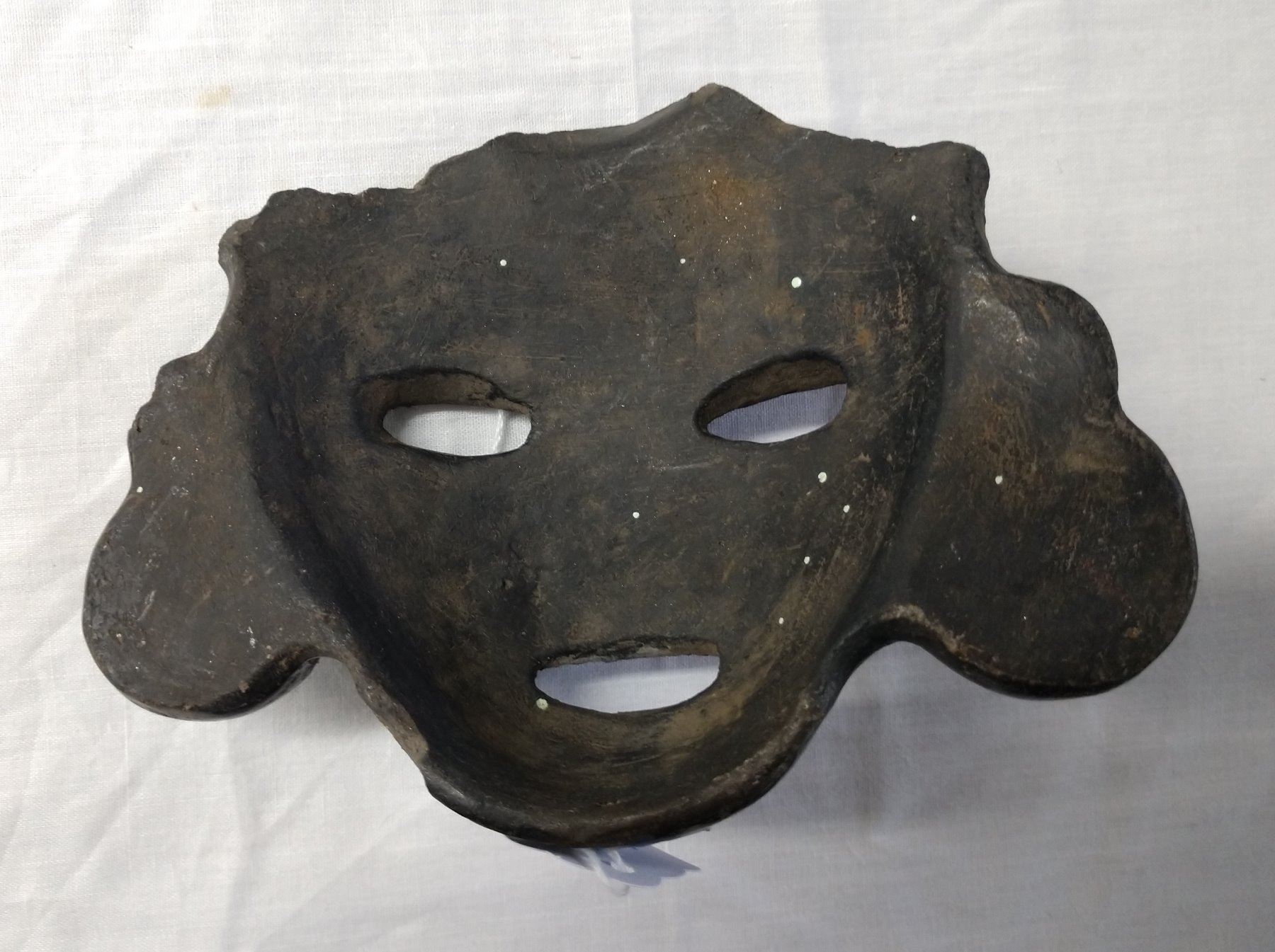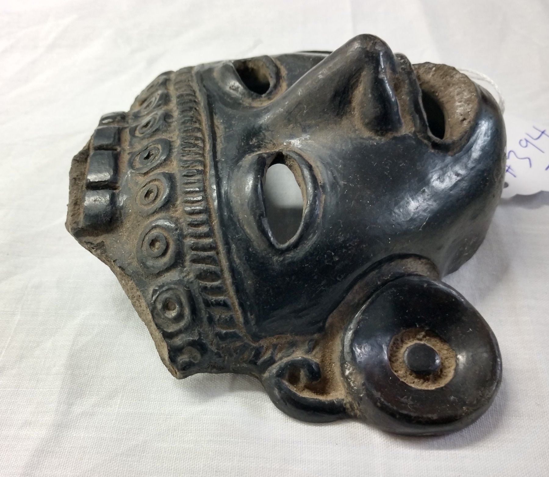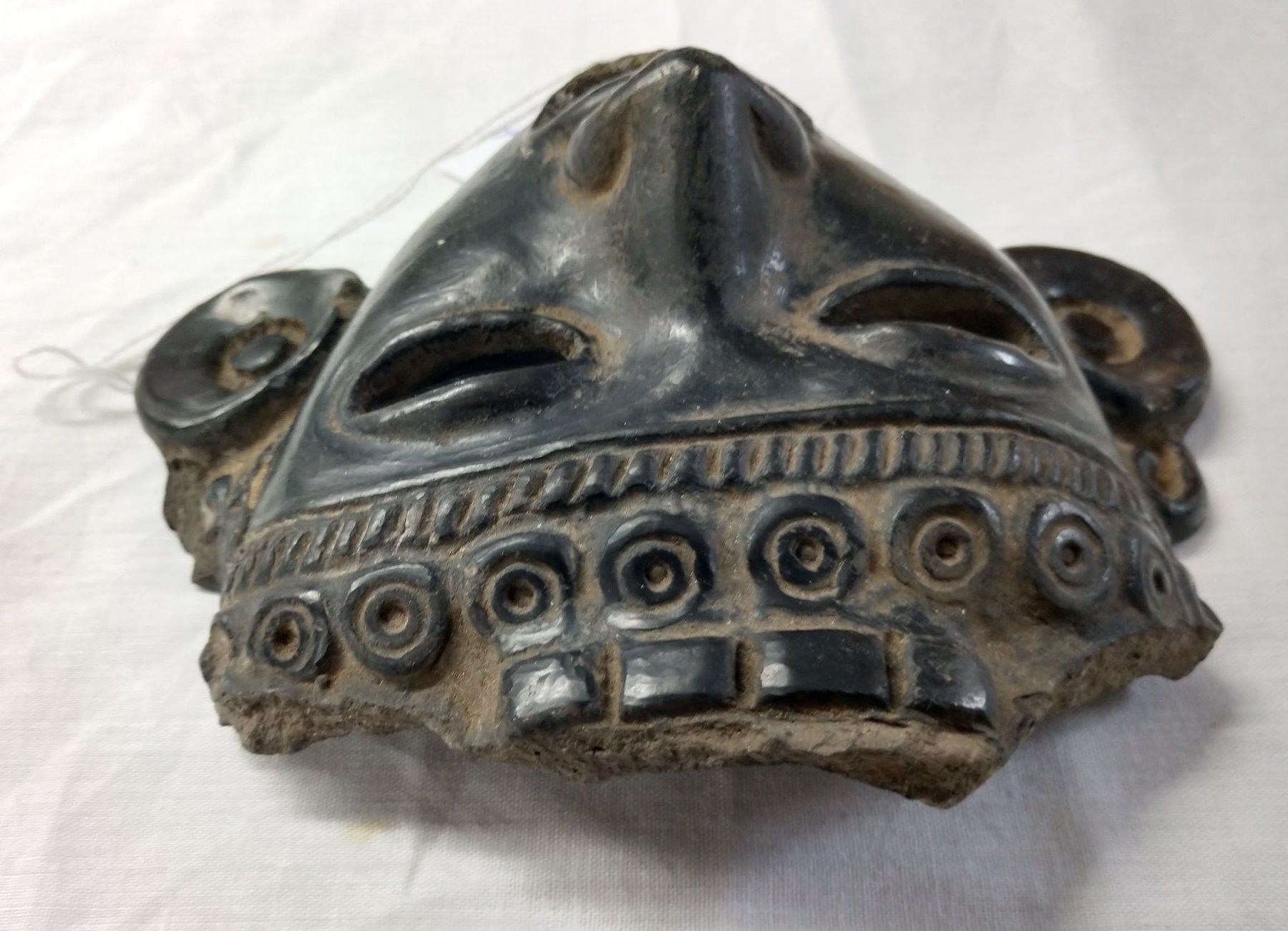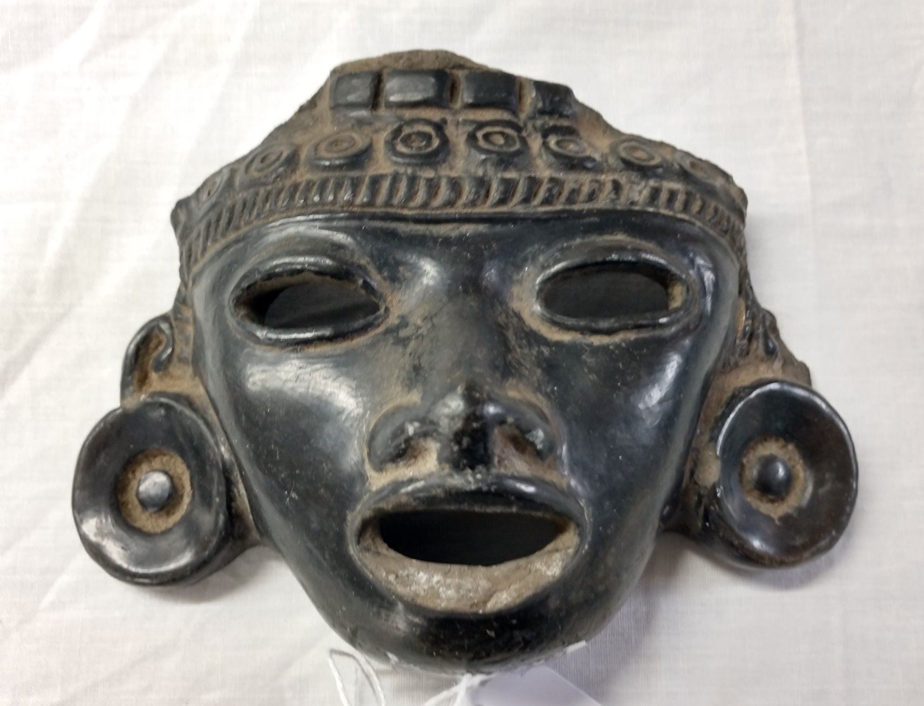 Veracruz Mask, pre-Columbian item. Made of black clay, the item measures 5 1/2" x 4" x 2". Veracruz, Mexico. From an old, 1960s California collection. Condition: Damage on top, see images. Shipping: $22.50 w/insurance and signature.
