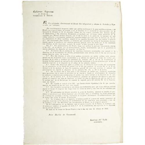 <B>[Broadside] Rare Decree Regarding Election Procedures for the State of Coahuila y Tejas by Governor Juan Martin Veramendi. </B></I> Leona Vicario, with heading <I>Gobierno Supremo del Estado de Coahuila y Tejas</B></I>, February 4, 1833. One page. Imperial Octavo. Dated and signed in print at end: <I>Es dado en la ciudad de Leona-Vicario a los 4 dias del mes de febrero de 1833. Juan Martin de Veramendi. Santiago del Valle secretario.</B></I><BR><BR>On December 18, 1832, Juan Martin de Veramendi took up the duties of Governor of the state of Coahuila and Texas. This decree provides Santa Anna's argument for the necessity of new elections and gives his approval of the Zavaleta plan to accomplish this goal. The tract then lists ten articles spelling out the details, including procedures concerning the elections of individuals to serve in the State Congress, president and vice-president, and two senators to the National Congress. As a result of the elections, Santa Anna was elected President. <BR><BR>In one instance here Veramendi is incorrectly identified as vice governor; he was actually governor at the time, having taken up his duties as governor on December 18, 1832. Voting was held in the various states and carried out without opposition, resulting in Santa Anna's election as president of Mexico. Red half-calf case with gilt lettering on spine. Clean and sharp, in very fine condition. <I>From the collection of Darrel Brown.</B></I><BR><BR><B>Reference:</B></I> Streeter <I>Texas</B></I> 789. Locating only his copy. Eberstadt 162:876. Jenkins 68.<BR><BR><b>Shipping:</b> Books & Catalogs (<a target="_blank" href="http://www.heritageauctions.com/common/shipping.php">view shipping information</a>)