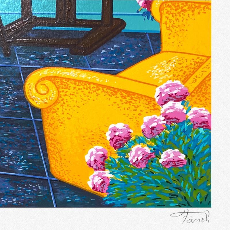 "Veranda Matisse" is a limited edition serigraph on paper by Fanch, AP numbered 1/50 and hand signed by the artist. Includes Letter of Authenticity. Measures approx. 24" x 20" (border), 21" x 17.5" (image). This proof came from Fanch Ledan's personal collection. It may have some slight imperfections in the image and border, but it's overall condition was inspected and approved by him.