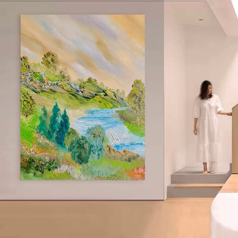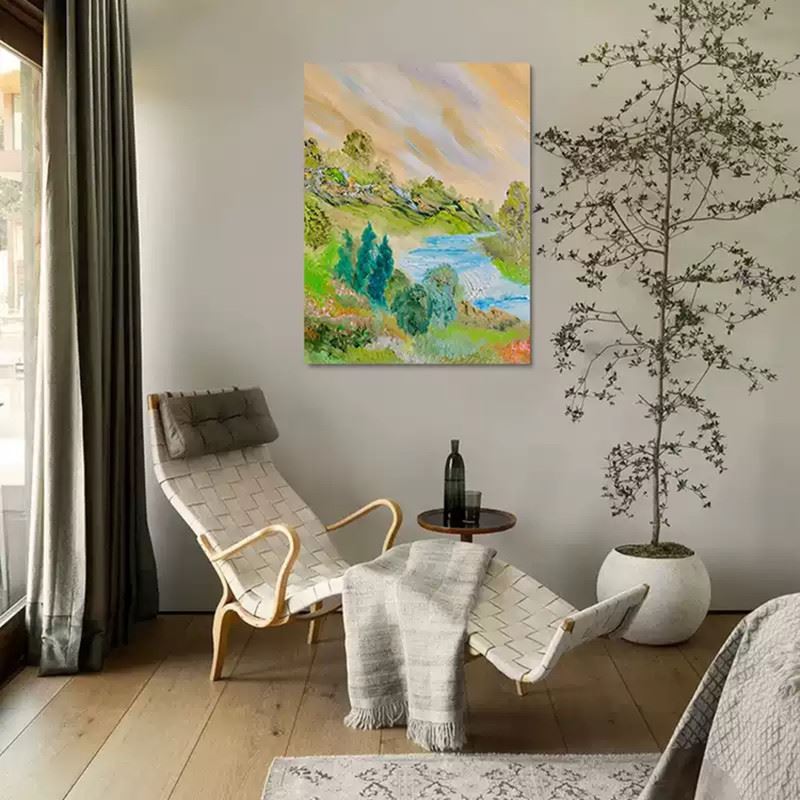 The painting depicts a lush and verdant landscape, with a blue stream winding through the green hills. Tall trees are scattered across the distant ridges, while the water flows gently, symbolizing abundance and hope. The fresh and vibrant natural scenery brings a sense of peace and vitality, evoking prosperity and growth. Dimensions: 24 x 31 inches.