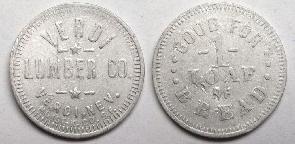 Aluminum. Verdi Lumber Co. Verdi, NV/Good for 1 loaf of bread. See Nevada Trade Tokens, 1990, Va-6City: VerdiCounty: WashoeState: NVDate: