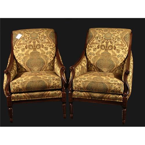 Brilliant embroidered Pair of Arm Chairs are striking placed where ever. Rich tones adorn every inch of this amazing and meretricious fabric. These beauties speak for themselves.