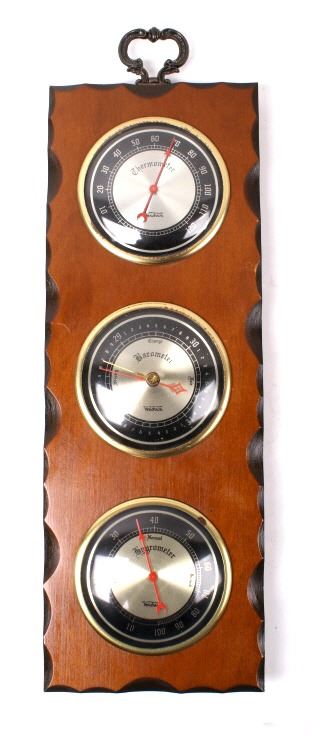 For your bidding pleasure is this Verichron Thermometer Barometer Hygrometer. This panel is in good condition showing a display of Thermometer, Barometer, and Hygrometer. These meters are placed on a oak wood panel with a decorative hanger at the top. The measurements of this panel are 18 1/4" x 6".