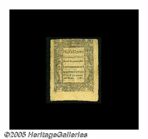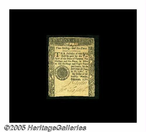 <B>Vermont February 1781 2s6d Extremely Fine.</B></I> One of the nicest Vermont notes that CAA has offered. This piece is solid, beautifully printed and problem-free save for very minor restorations. The horizontal center fold had been split at both ends and is now sealed, and the two upper corner tips have been restored. The restorations are done with consummate skill, making them invisible under all but the closest of expert scrutiny. The note has some margin all around, although it's small in most places. The back design is very well centered on three sides and slightly touching at the top. All Vermont notes are very rare, and most known examples are in extremely low grade. The majority of Vermont Colonials have been pieced together from several different notes, often of different denominations. Vermonts are unpriced in Newman above the Very Good grade. They are printed on thin, weak paper that quickly disintegrated in circulation. Their scarcity is due to the fact that only a single issue was emitted, and that issue, authorized in February of 1781, had its legal-tender status revoked after a little more than a year in circulation. The scarcity was increased by the fact that these notes retained their validity for tax payments, but the Treasury was denied the right to re-issue the bills, and they were burned when received as taxes. The note is sharply printed, and it has tremendous eye appeal. A spectacular piece, fit for the very finest collection.