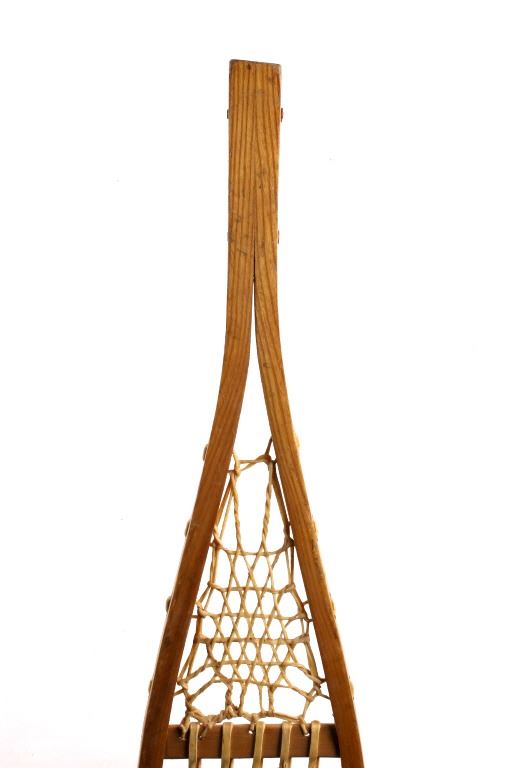 For your bidding pleasure Vermont Tubbs Inc. Rawhide Woven Snowshoes. An excerpt from their website states, "Tubbs Snowshoes’ mission is to encourage adventure, exercise, family fun, and human connection to nature by providing high quality snowshoeing equipment, to get people outside and in the snow." The company was founded in 1906 as a pioneer of American snowshoeing industry in Norway, Maine. Showing the sticker with the logo and name placed in front of the leather foot bindings, stamped with the size and type identification of 10x56-SI. These snowshoes are in good condition showing a strong sturdy wooden frame with rawhide basket weave with smaller samples of rawhide weave with thicker samples of rawhide. The measurements of these snowshoes are 10" x 56".