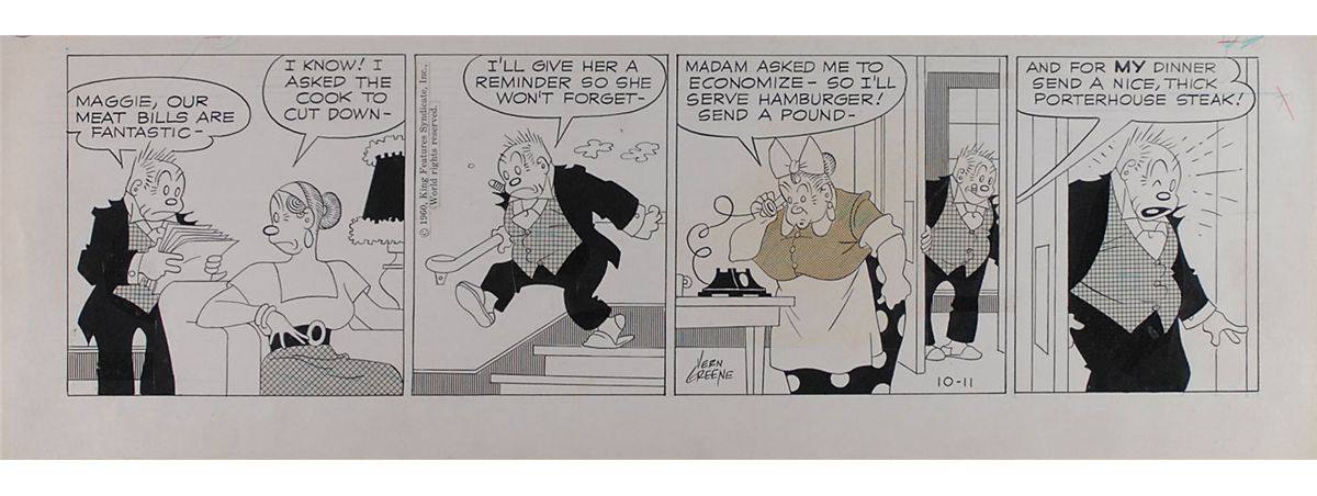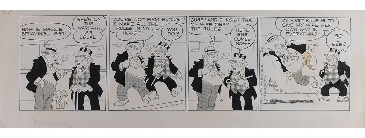 Two original hand-inked Bringing Up Father comic strips, ink with applied pattern transparencies on artist’s cardstock, each 20 x 6.5, 1960, depicting the complicated lives of Maggie and Jiggs. Both are signed in a panel, “Vern Greene.” In overall fine condition.