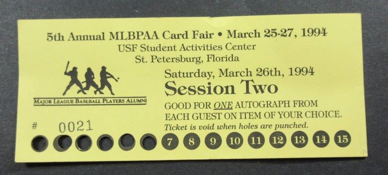 Includes Ticket from signing event - 5th Annual MLBPAA Card Fair March 25-27, 1994. No COA. EST 50.00-60.00