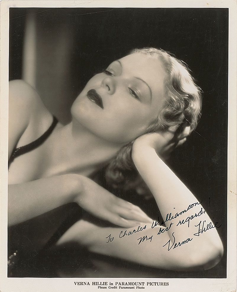 Gorgeous glossy 8 x 10 Paramount Pictures publicity photo, signed and inscribed in black felt tip, “To Charles Williamson, My best regards, Verna Hillie.” Light creases to borders and corners, and a small tear to right border, otherwise fine condition.