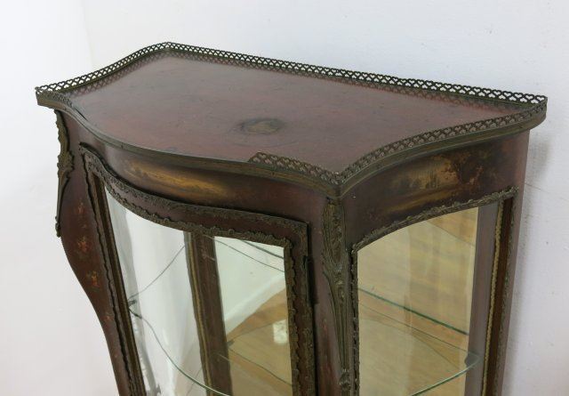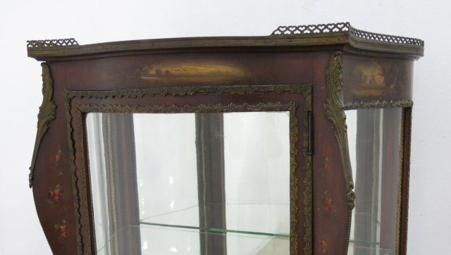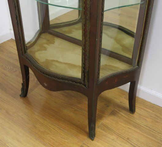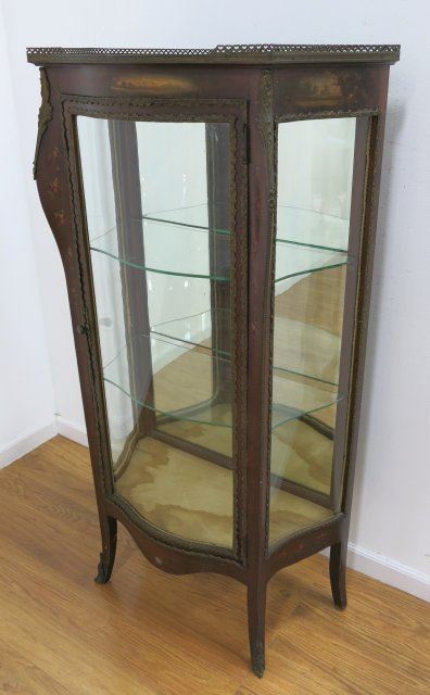 Ca. 1900. Serpentine glass, mirrored back, glass shelves. Labeled R. J. Horner. Approx. 56" H x 29 1/2" W x 15" D.