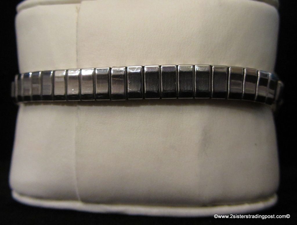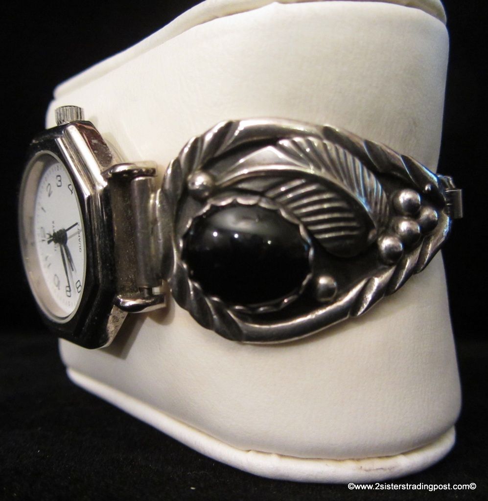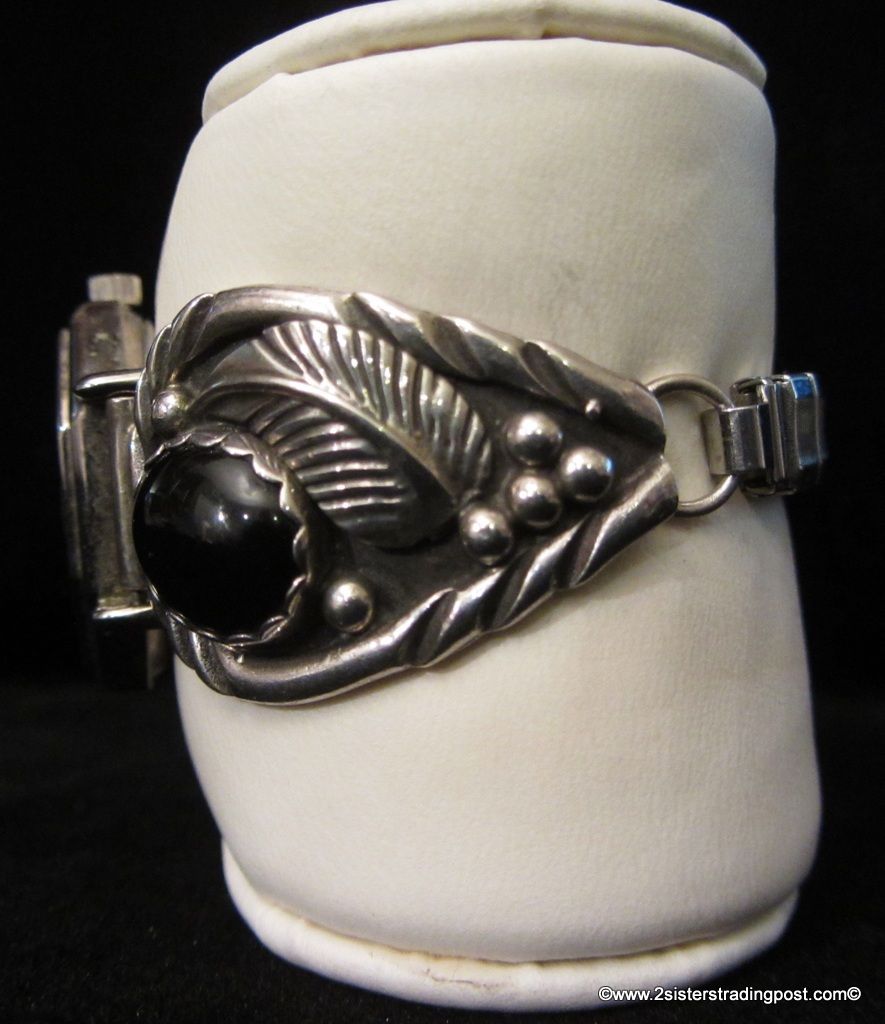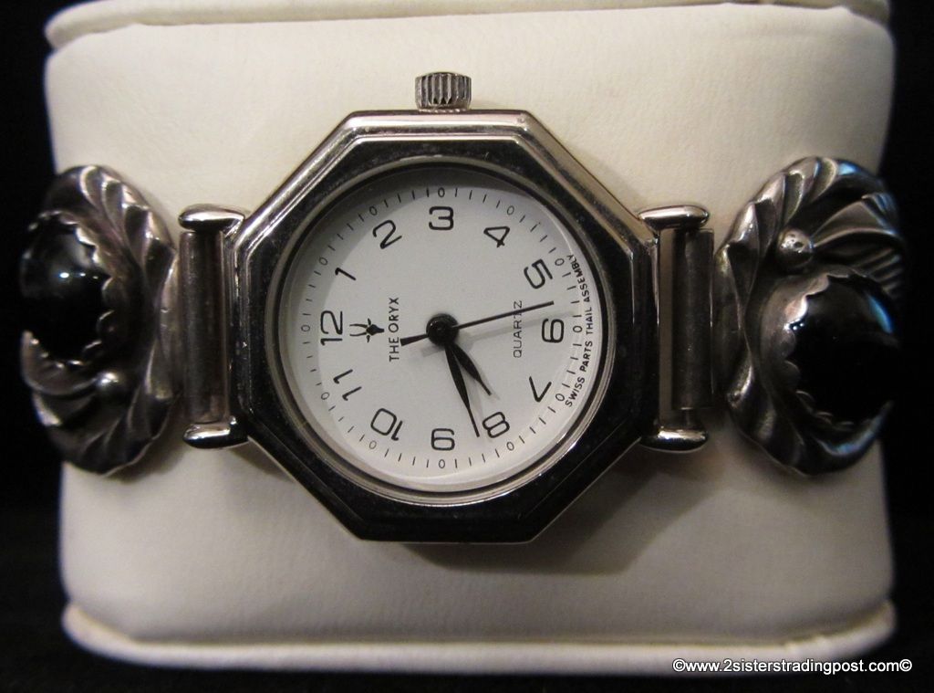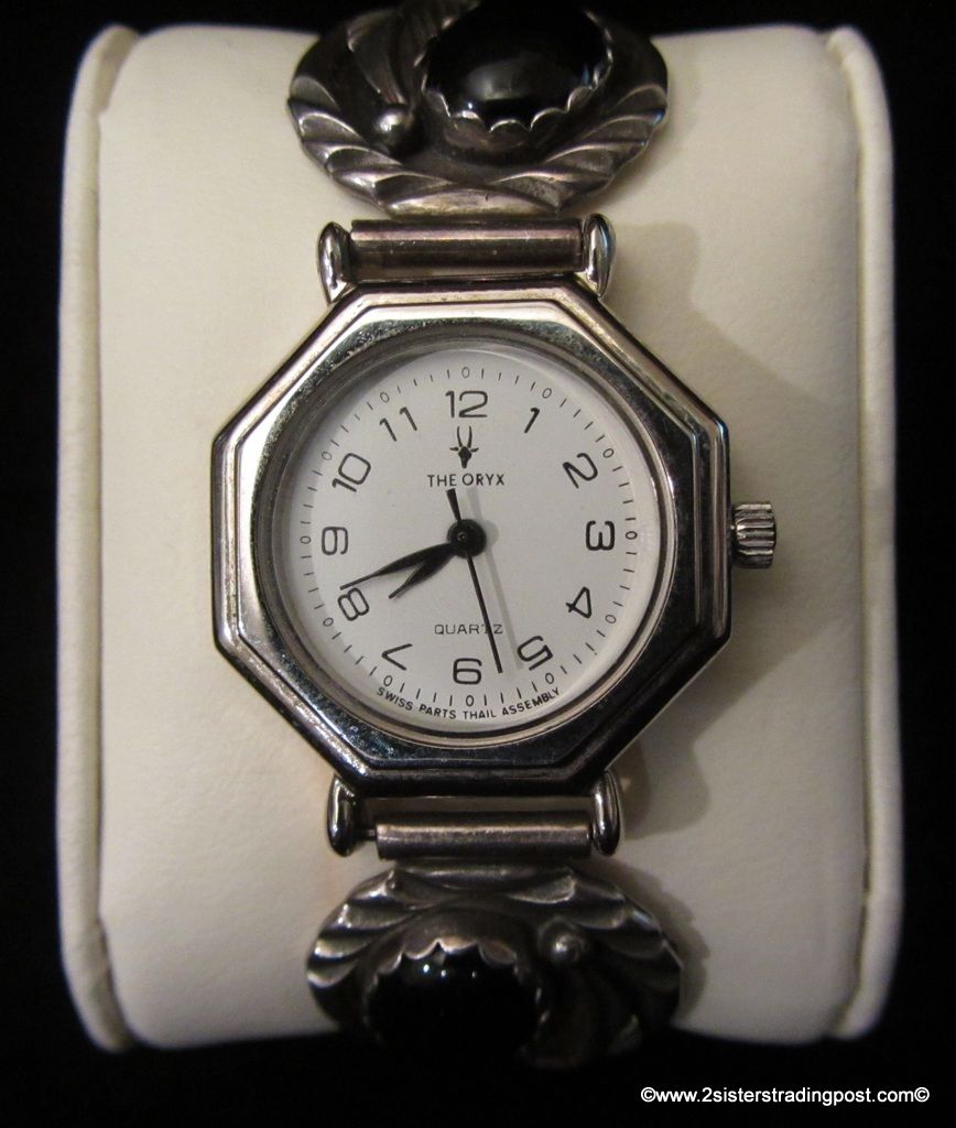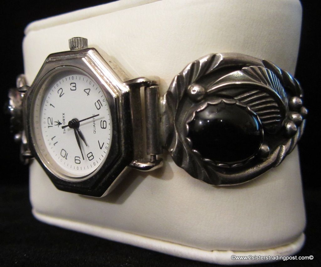 Navajo teardrop shaped watch tips in sterling with feather pattern and oval cabochon onyx. Watch tips measure 21.3 mm at widest point x 7.5 mm at strap end and are approximately 31.6 mm long. Tips come with a octagon shaped 'The Oryx' quartz movement timepiece & silver colored expansion band. Piece is stamped sterling and VB (Vernon Begay Hallmark) by the artist, and has the pictorial Oryx ® ™ NOTE: Owner states all timepiece worked when they were put into storage.