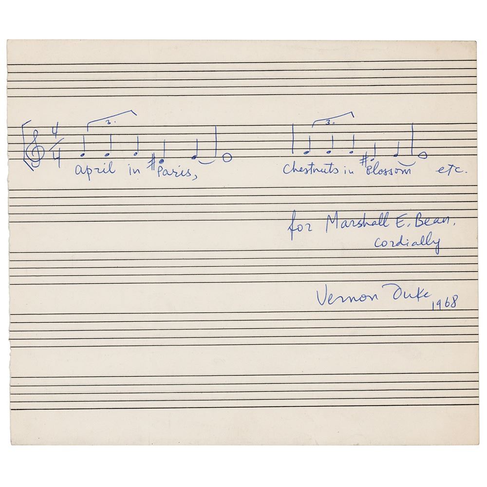 Russian-born American composer and songwriter (1903–1969) noted for his collaborations with Ira Gershwin, E. Y. Harburg, and Sammy Cahn. AMQS on a white 9 x 6 musically lined sheet, signed and inscribed below in blue ballpoint, "For Marshall E. Bean, Cordially, Vernon Duke, 1968." Duke pens four bars from "April in Paris," writing the lyrics below. In fine condition.
