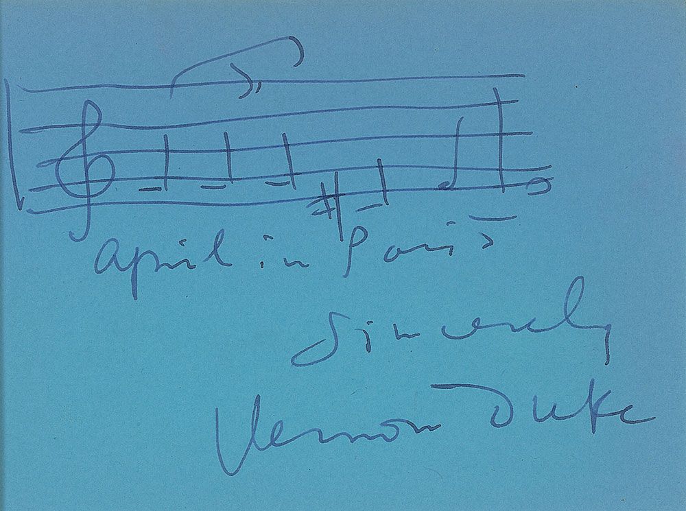 Uncommon AMQS on a light blue 5.5 x 3.75 sheet. Duke pens two bars of music from ‘April In Paris,’ signed underneath, “Sincerely, Vernon Duke.” In fine condition.