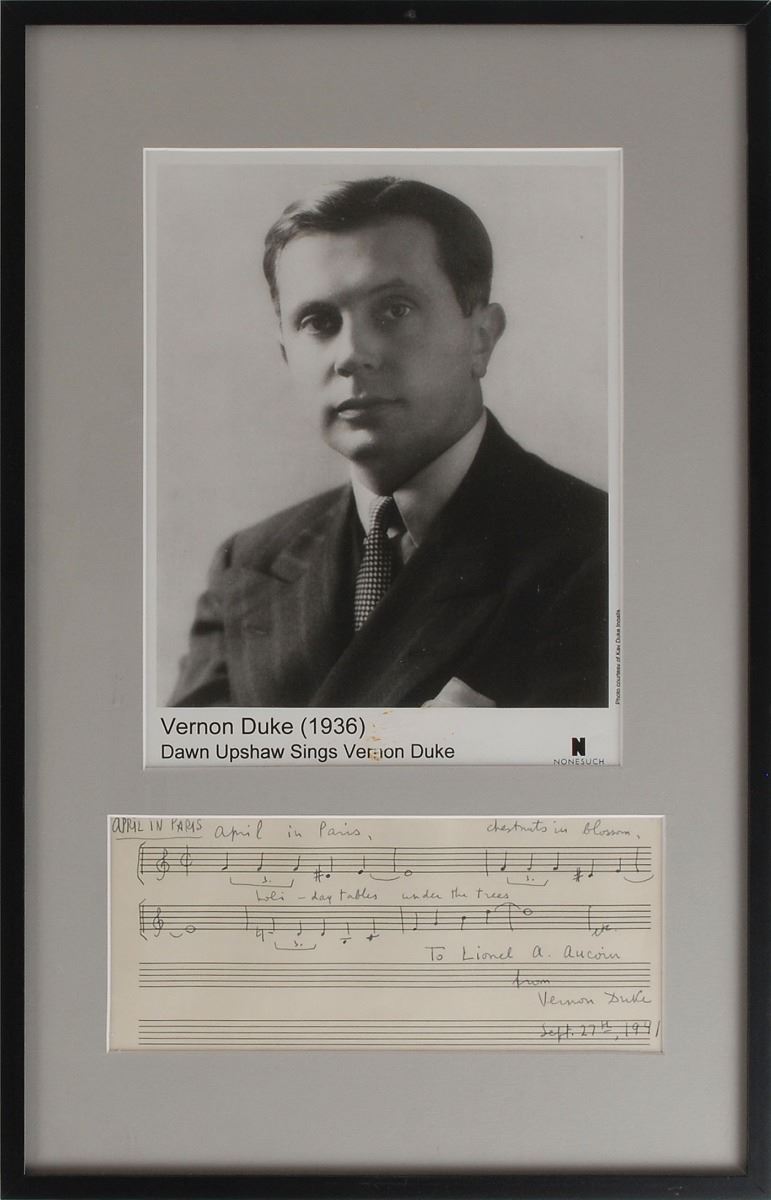 American composer and songwriter (1903–1969) noted for his collaborations with Ira Gershwin, E. Y. Harburg, and Sammy Cahn. Two items: a seven-bar AMQS of music and lyrics from “April in Paris,” signed and inscribed in fountain pen, “To Lionel A. Aucoin, from Vernon Duke, Sept. 27th, 1941,” matted and framed with a publicity photo; and a hardcover first edition of Passport to Paris, with dust jacket, signed on the first free end page in ballpoint, “This independent batch is for the scratches. Sincerely, Vernon Duke, May 1955.” In overall fine condition.