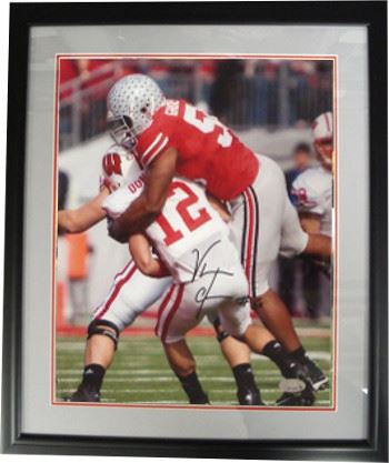 In 2006 Vernon Gholston earned Second-team All-Big Ten honors from both the league's coaches and the media while starting 13 games. During the 2007 season Gholston recorded 37 tackles (15.5 for a loss) and set a school record with 14.5 sacks in 13 games, breaking the former record of 13 sacks in a single season set in 1995. He was named All-America by Pro Football Weekly and was First-team All-Big Ten. Vernon Gholston has hand autographed Ohio State Buckeyes 16x20 Photo vs Wisconsin. Custom White Mat and Premium Black Color Framed as shown. Certificate of Authenticity from Athlon Sports Collectibles.