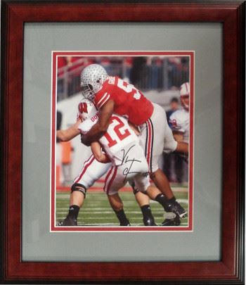 In 2006 Vernon Gholston earned Second-team All-Big Ten honors from both the league's coaches and the media while starting 13 games. Gholston had 49 tackles and his 18 tackles behind the line of scrimmage, which led the team, included 7.5 quarterback sacks, ranked second on the team. During the 2007 season Gholston recorded 37 tackles (15.5 for a loss) and set a school record with 14.5 sacks in 13 games, breaking the former record of 13 sacks in a single season set in 1995. He was named All-America by Pro Football Weekly and was First-team All-Big Ten. Vernon Gholston has hand autographed this Ohio State Buckeyes 8x10 Photo vs Wisconsin. Custom Gray and Red Mat with Premium Wood Color Frame. Sports Images Hologram and Certificate of Authenticity from Athlon Sports Collectibles.