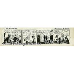 <B>Vernon Greene - Shadow Daily, Original Art Comic Strip Art (Ledger Syndicate, undated).</B></I> The Shadow, sometimes known as Kent Allard or Lamont Cranston, burst onto the entertainment scene in the February, 1929 pulp, <B>Fame and Fortune</B></I>, as a green-caped vigilante working the Wall Street district. The <I>Shadow</B></I> newspaper strip stayed close to the original version of the pulps, both in mood and execution; it had a four-year run from 1938-42. Vernon Greene proved to be a superb action-adventure artist, and his strips spread the Shadow's warning that, "The weed of crime bears bitter fruit." The image area of this daily is 25" x 5.5", and the condition is Excellent. The strip is numbered C-21. Don't hesitate to bid on this thrilling daily!