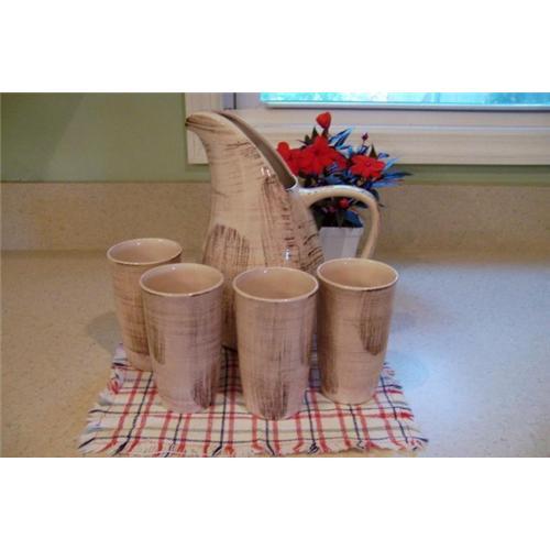 Vintage 50's Pitcher set by Vernon Kilns Vernonware. This pattern is called Barkwood. Creamy beige color with dark brown accents. The large 2Qt. pitcher has a great shape! The four hard to find tumblers are 5 1/2" tall 16oz. size. All pieces are in excellent condition! No chips, cracks or crazing. All are marked "vernonware Barkwood" on the bottoms. Great looking vintage set.