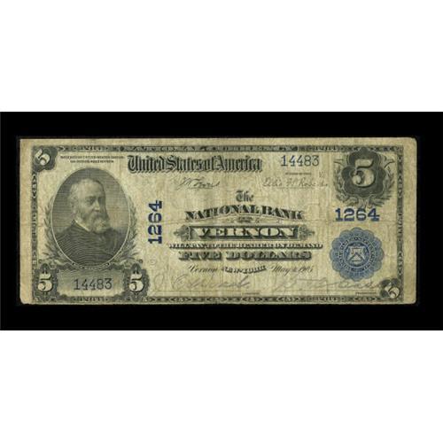 <B>Vernon, NY</B></I> - $5 1902 Plain Back Fr. 598 <B>The NB of Vernon</B></I> Ch. # 1264<BR> Third Charters are far scarcer than First Charters on this bank. This example has snappy paper and a small deft repair at back bottom center. <B>Very Good-Fine</B></I>.<BR><BR><b>Shipping:</b> Coins & Currency (<a target="_blank" href="http://www.heritageauctions.com/common/shipping.php">view shipping information</a>)