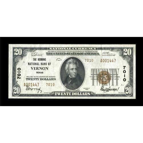 <B>Vernon, TX</B></I> - $20 1929 Ty. 2 <B>The Herring NB</B></I> Ch. # 7010<BR> Broad margins are noted on this pleasingly original issue. The embossing is bold and there is one fold too many for a full EF grade. <B>Very Fine-Extremely Fine.</B></I><BR><BR><b>Shipping:</b> Coins & Currency (<a target="_blank" href="http://www.heritageauctions.com/common/shipping.php">view shipping information</a>)