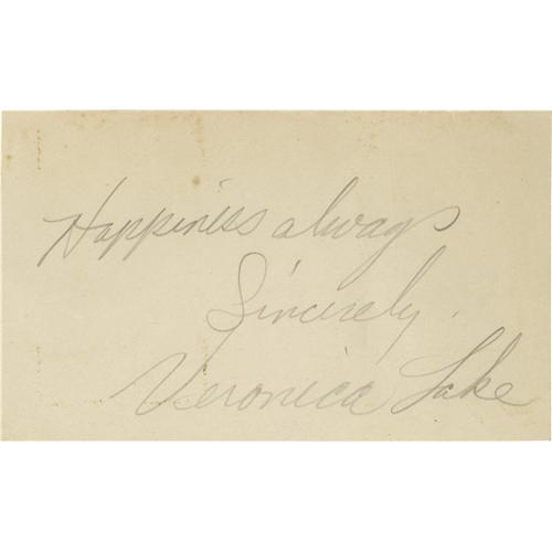 <B>Veronica Lake Autograph.</B></I> A 3" x 5" notecard inscribed and signed by the femme fatale in pencil, in Very Fine condition with mild tanning and soiling.<BR><BR><b>Shipping:</b> Flat Material, Small (<a target="_blank" href="http://www.heritageauctions.com/common/shipping.php">view shipping information</a>) <BR><BR><B>Important no